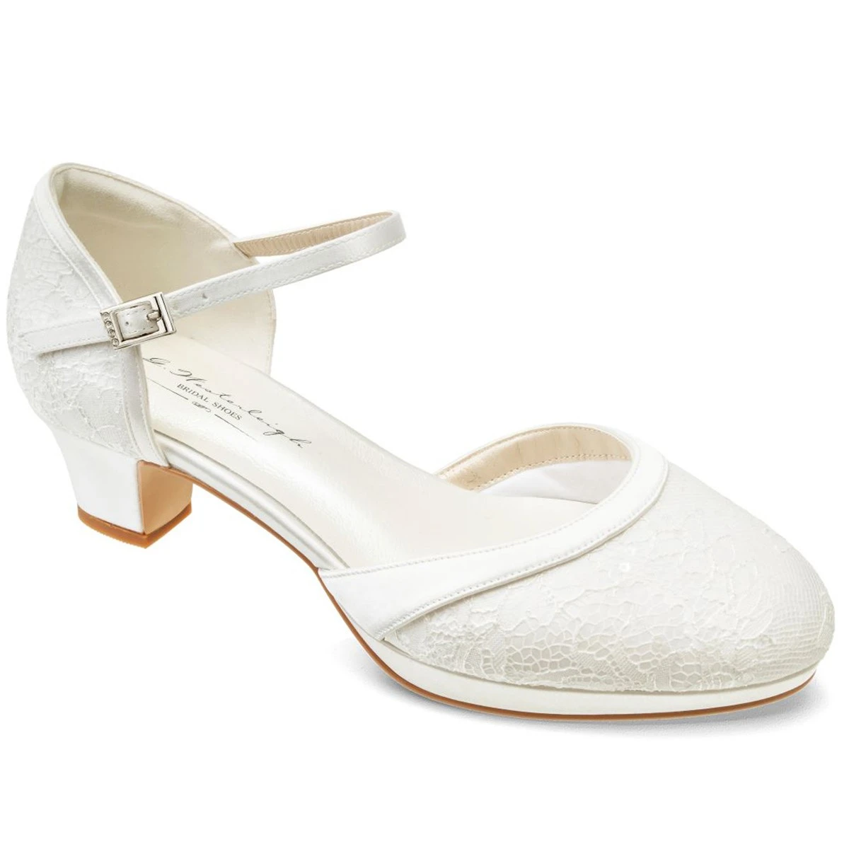 Les chaussures sont recouvertes d’une dentelle scintillante et équipées d’une semelle compensée et d’une bride à la cheville.