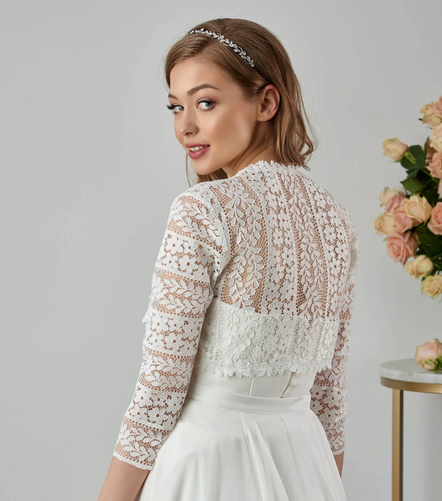 Boléro de mariée très romantique en dentelle guipure ivoire.