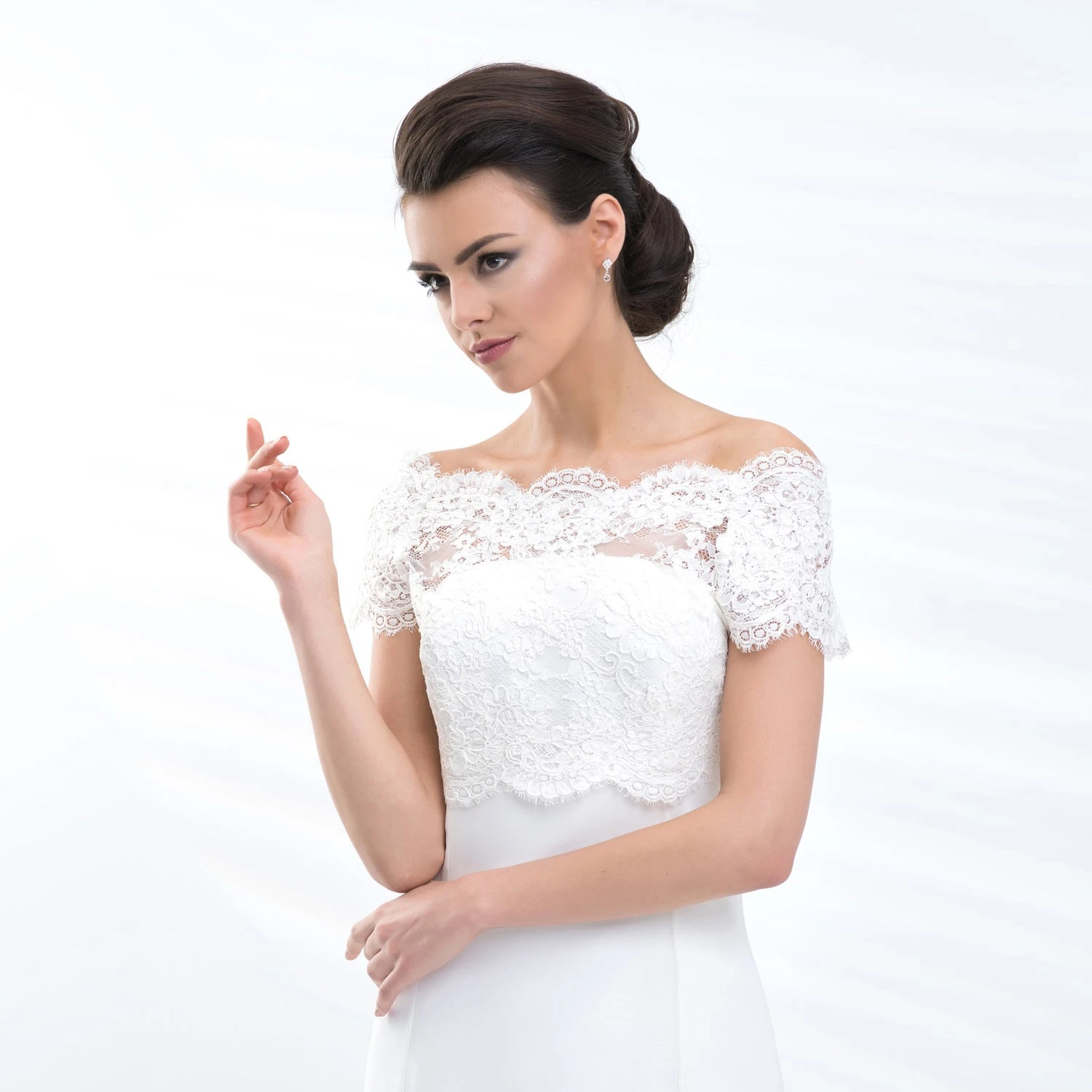 Boléro de mariée en dentelle délicate et à manches courtes.