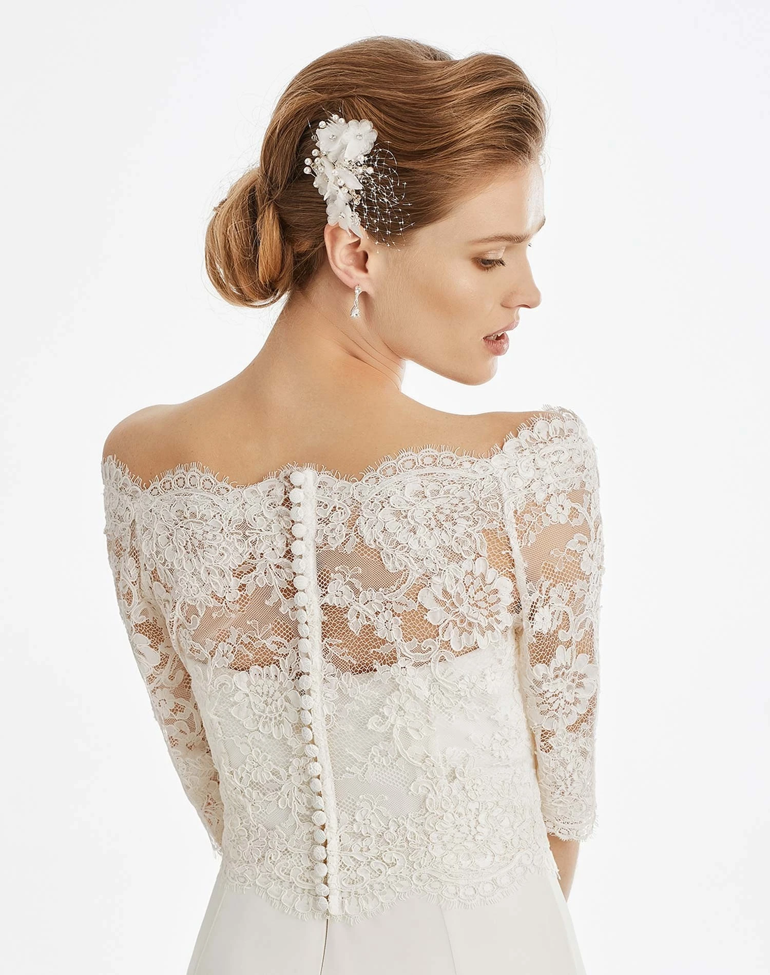 Boléro de mariage en dentelle ivoire à manches 3/4.