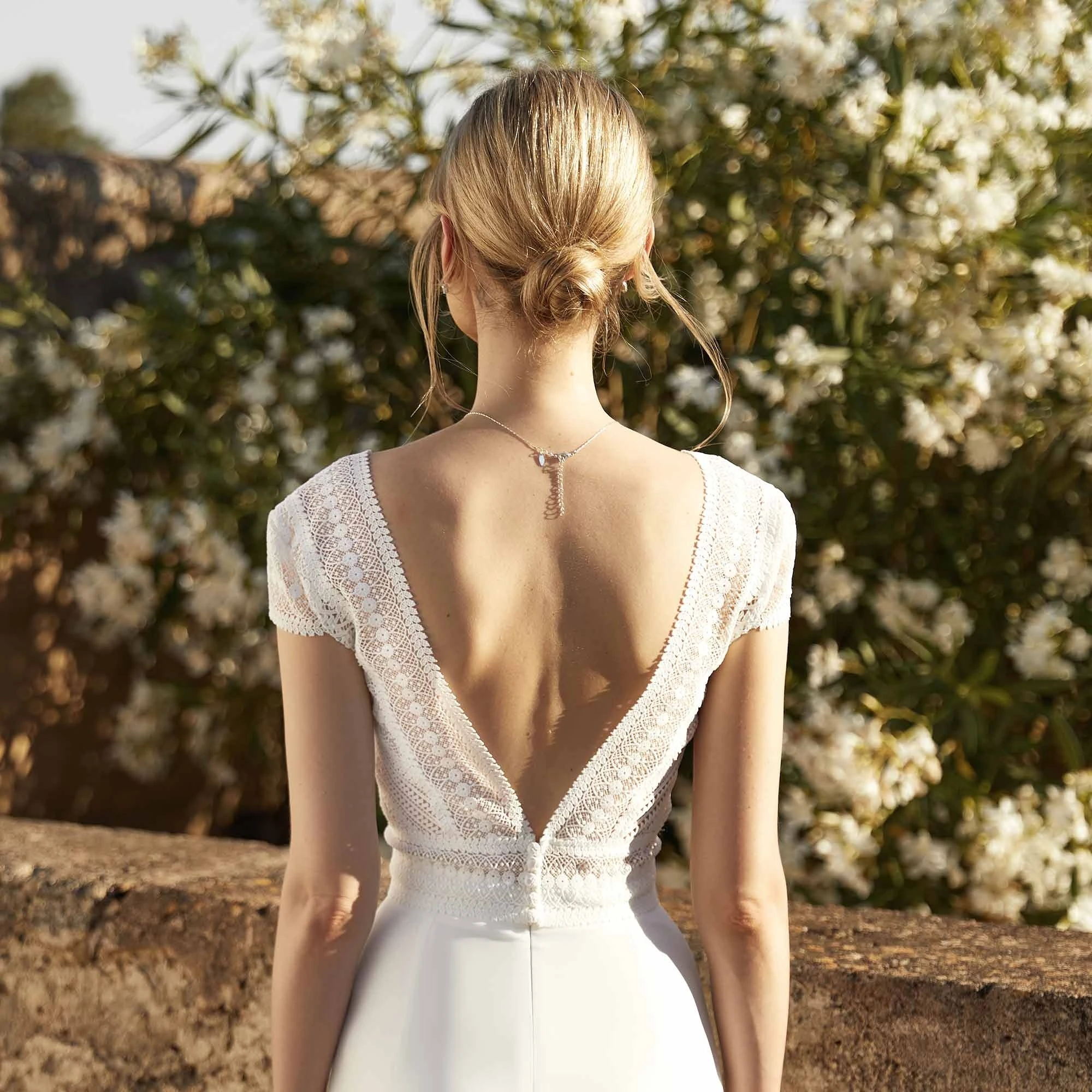 Proposé en dentelle ivoire, manches courtes et encolure en V.