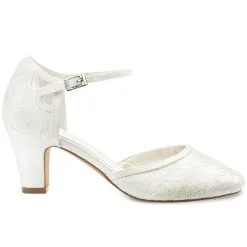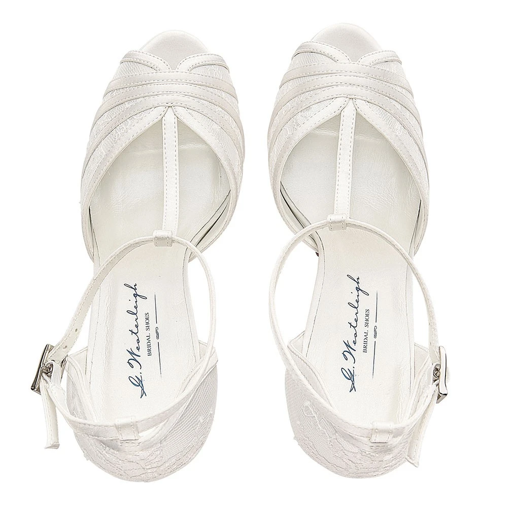 Chaussures de mariée à bout ouvert, recouvertes de dentelle avec bandes de satin à l’avant de la chaussure. Bride montante et bride à la cheville.