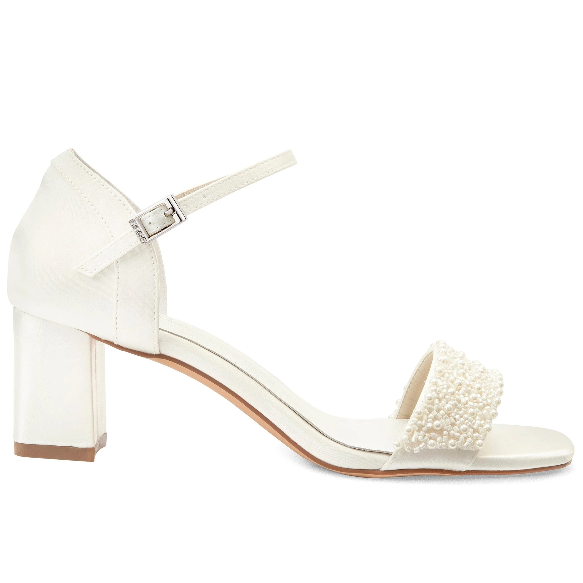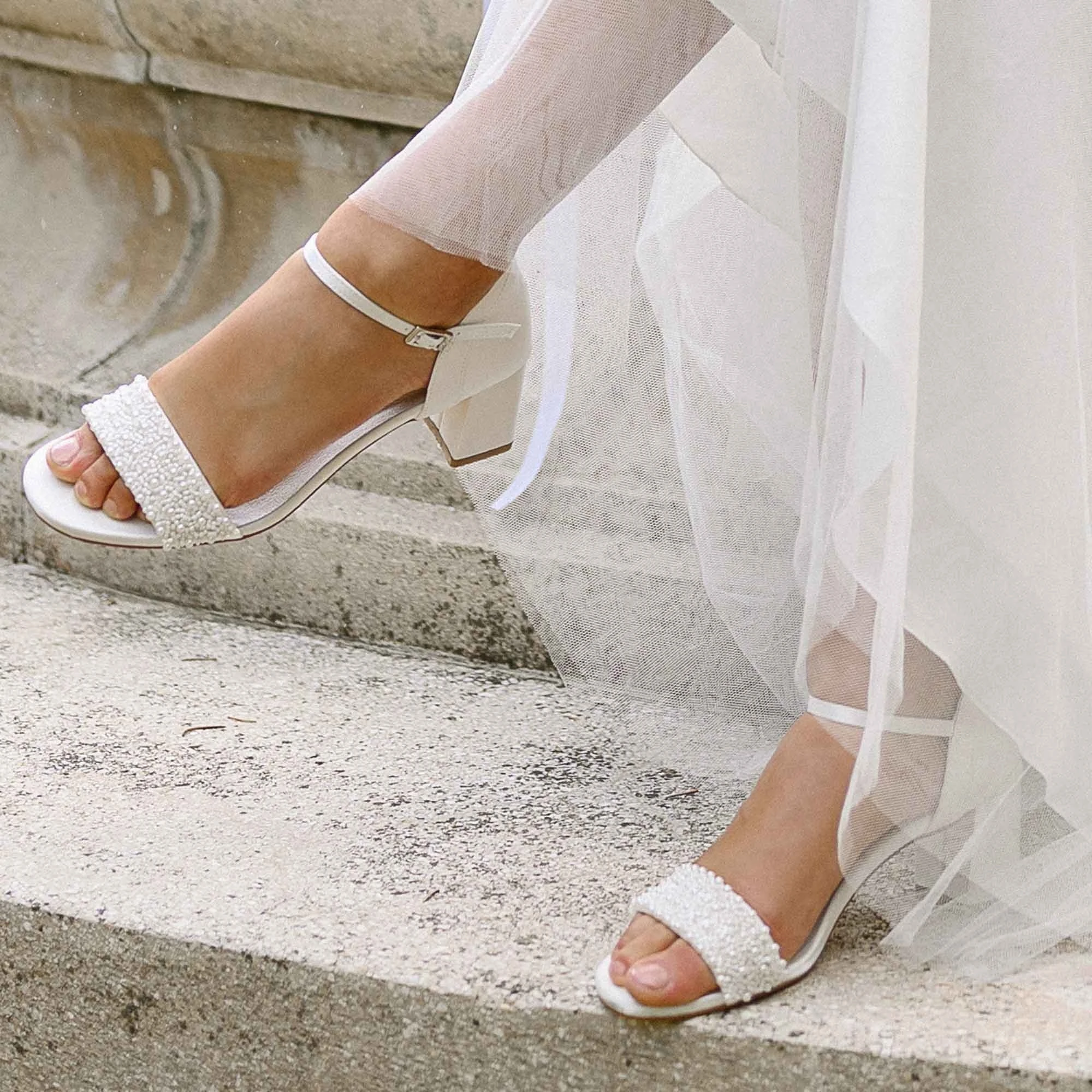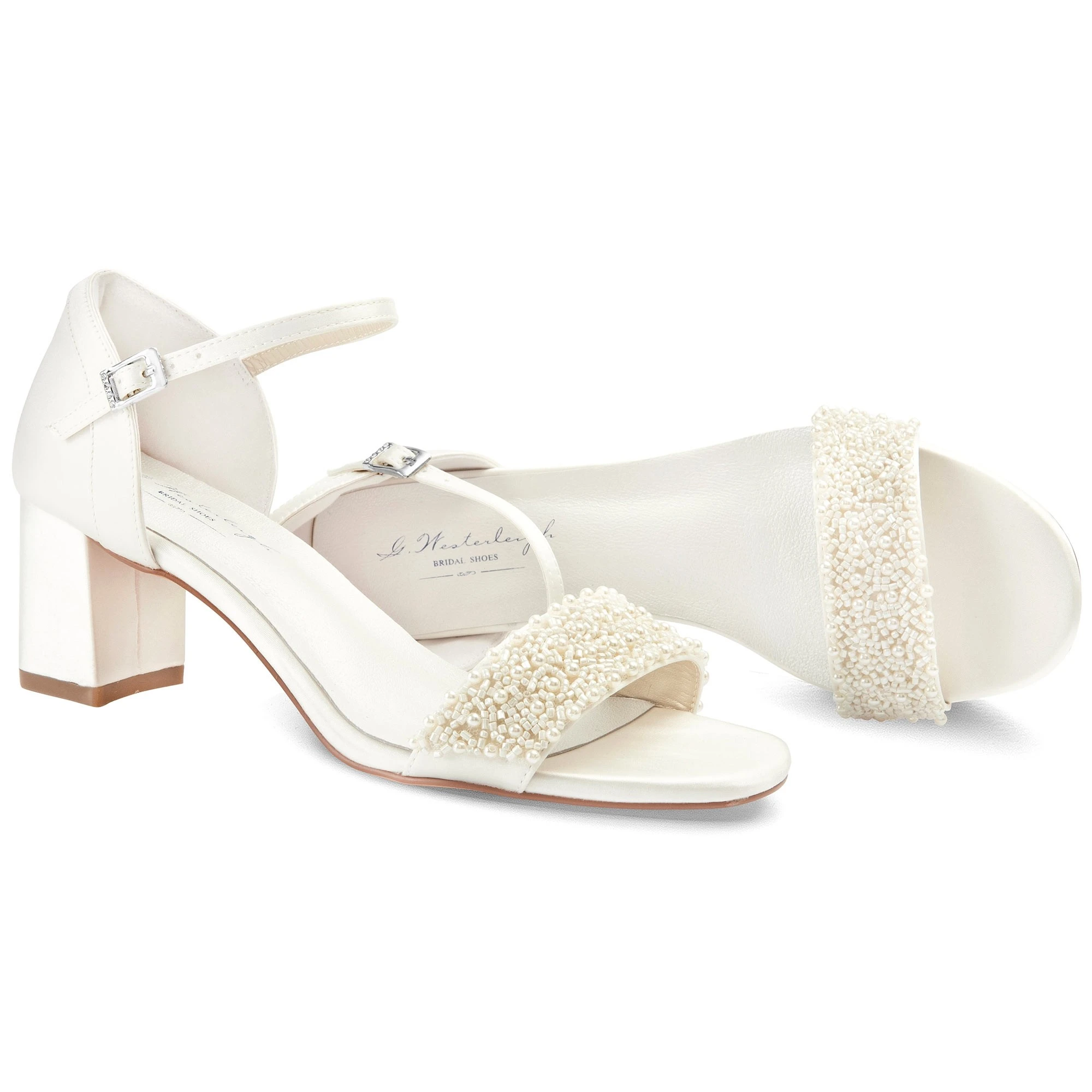 Lauren est une magnifique sandale de mariage décorée de perles nacrées sur la bride à l’avant de la chaussure.