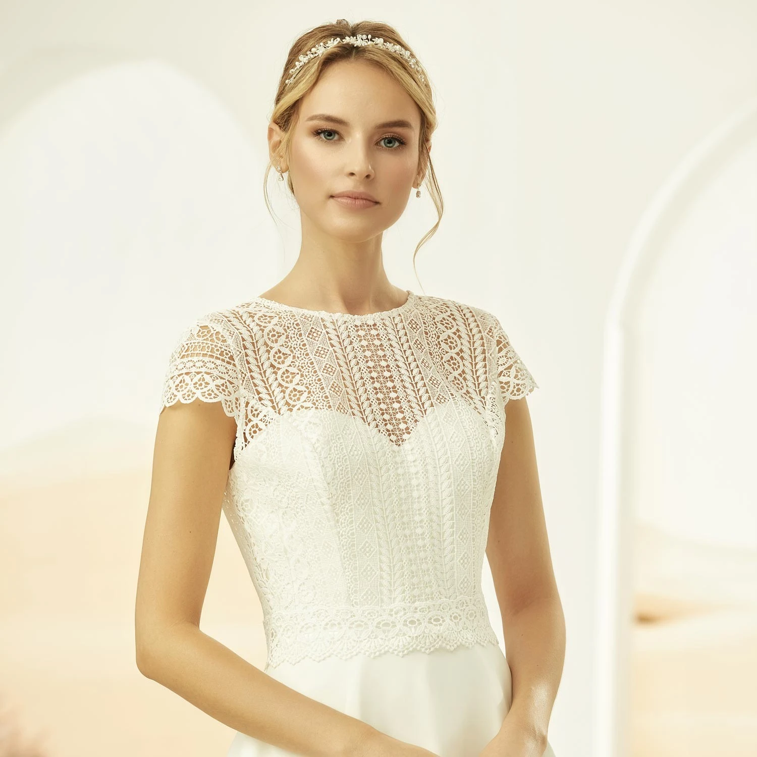 Boléro de mariage style bohème avec sa dentelle à forme géométrique.