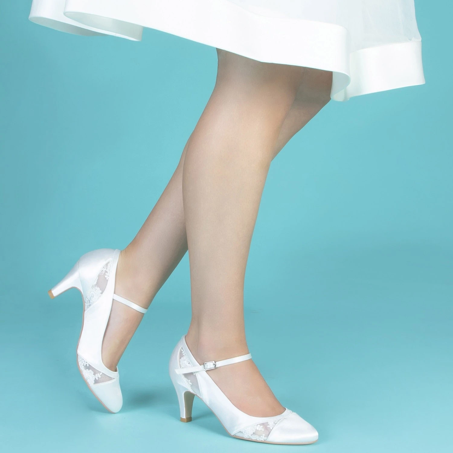 Faye est une chaussure de mariage à talon moyen très stable, avec des empiècements en dentelle florale et une élégante bride à la cheville.