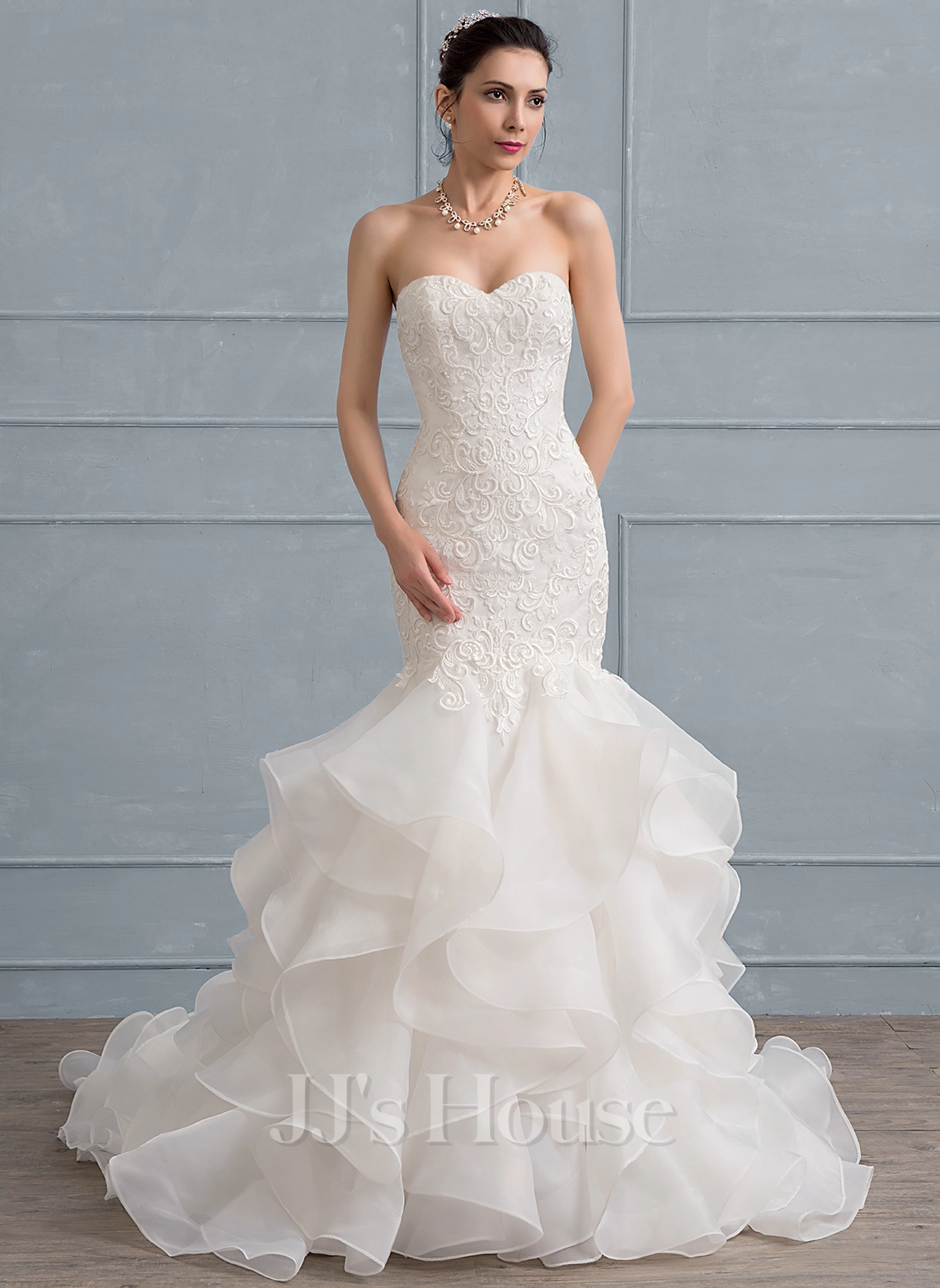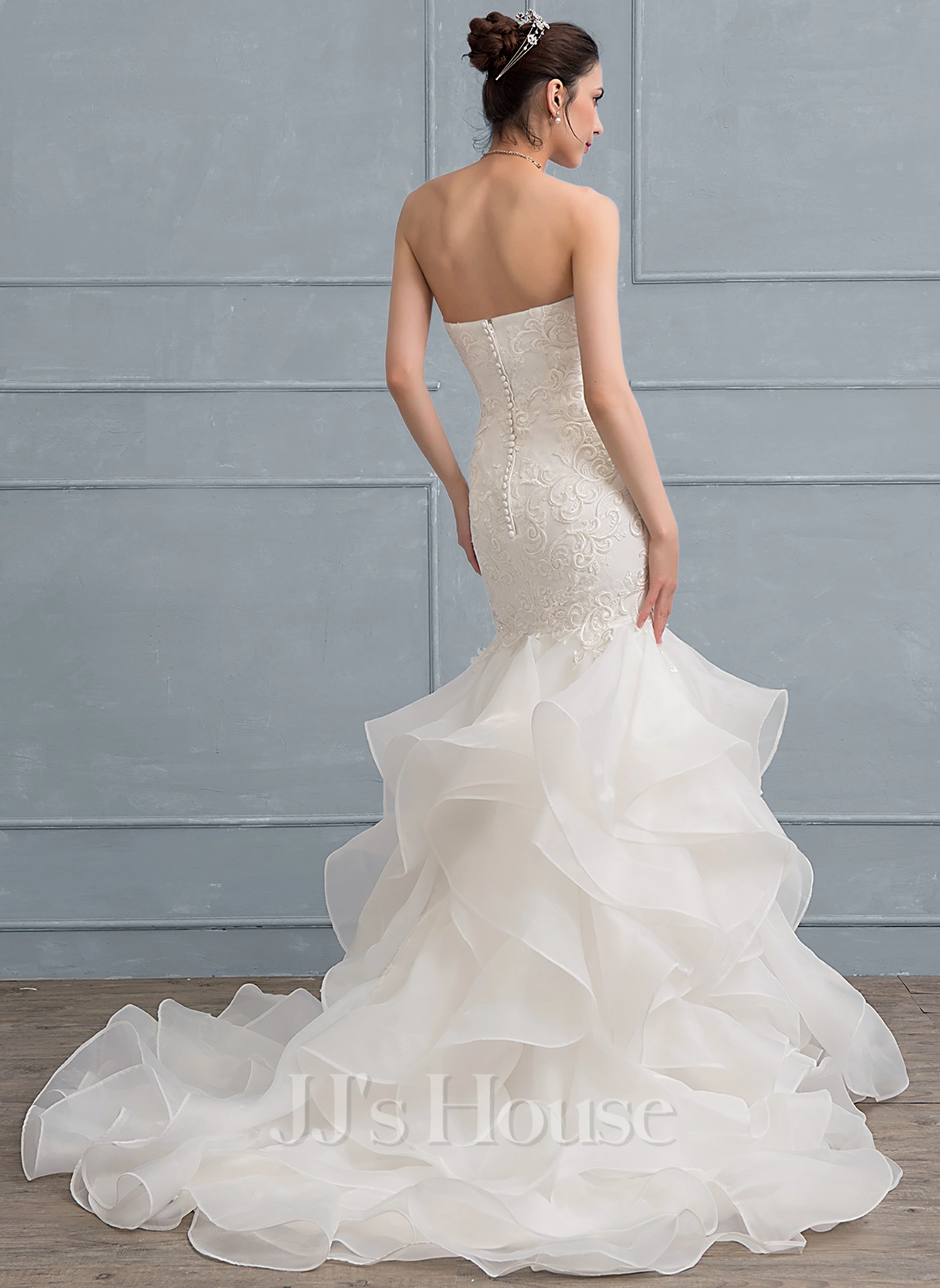 Voici une somptueuse robe de mariée sirène que vous ne devez pas laisser échapper ! À épaules dénudées, elle est réalisée en dentelle et organza. La dentelle épouse bien vos formes jusqu’au genou et l’organza crée un effet volanté en bas et donne de l’ampleur.
