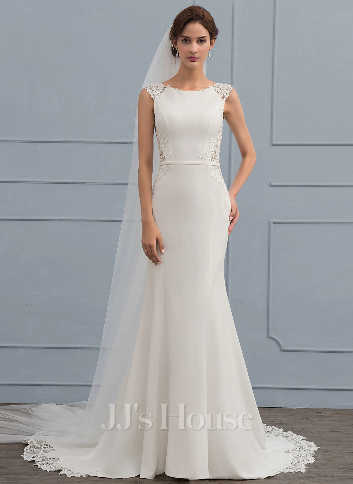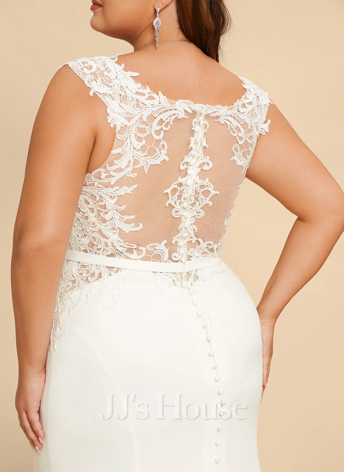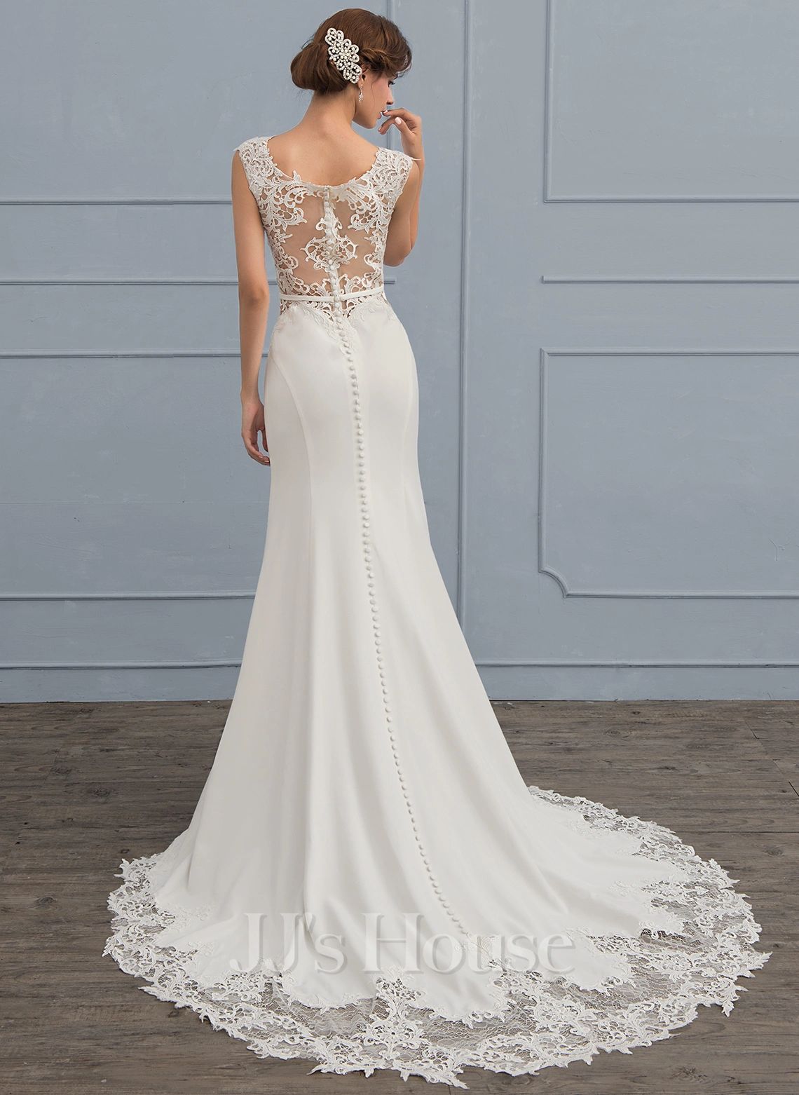 Une robe de mariée sirène en crêpe stretch et dentelle avec la traîne moyenne vous apporte un effet élégant et raffiné. La dentelle pare le dos transparent, les bretelles et les deux côtés de la taille. Cette création est décorée de bouton recouvert sur la fermeture éclair au dos.