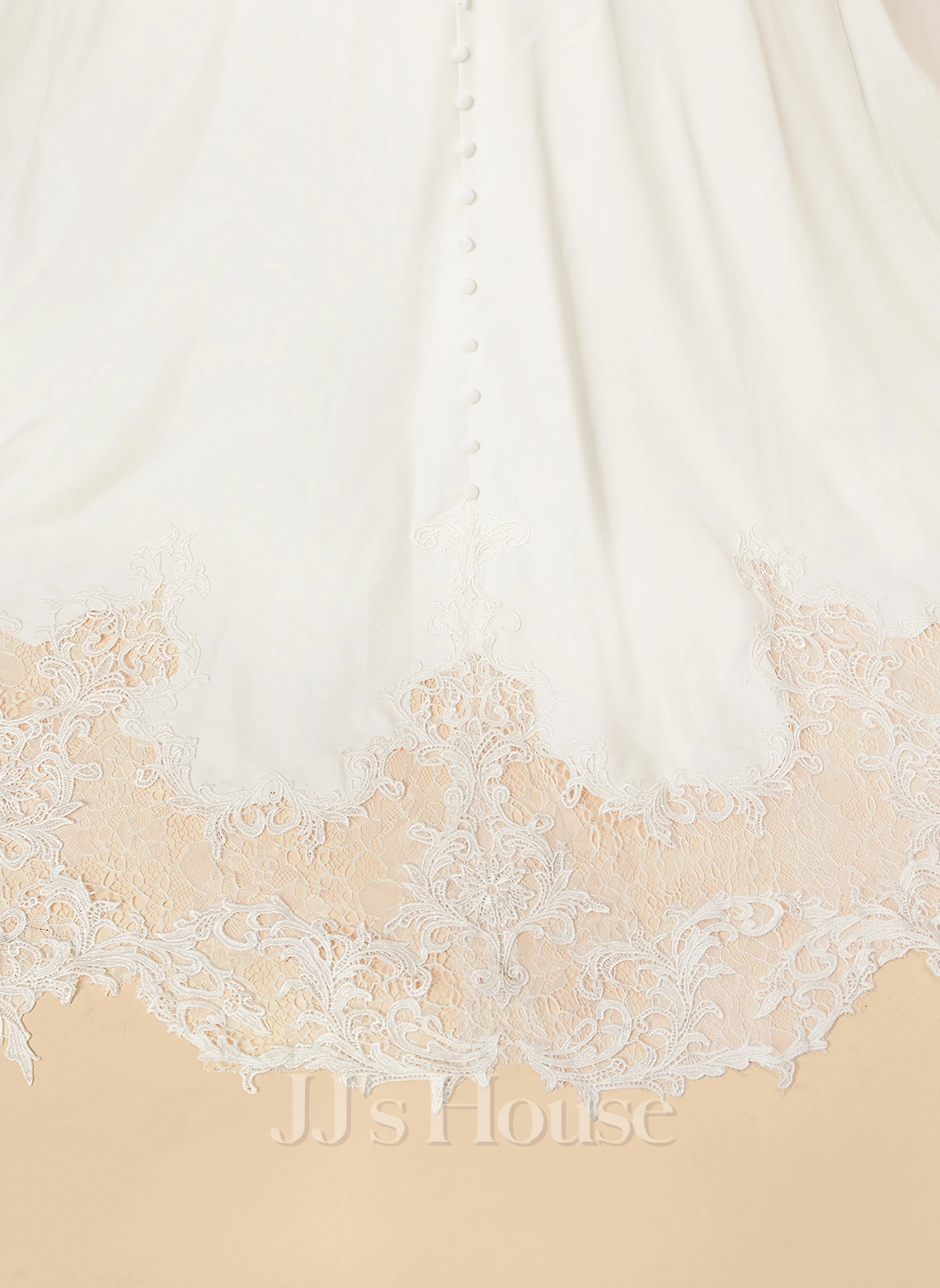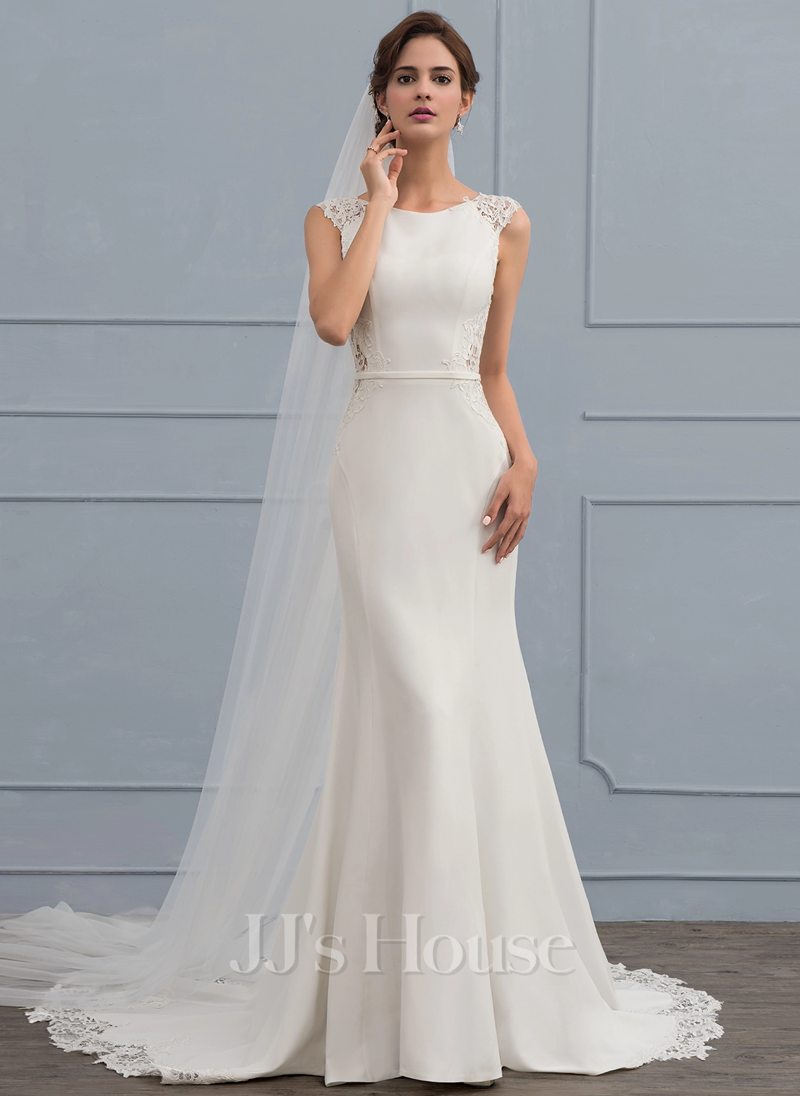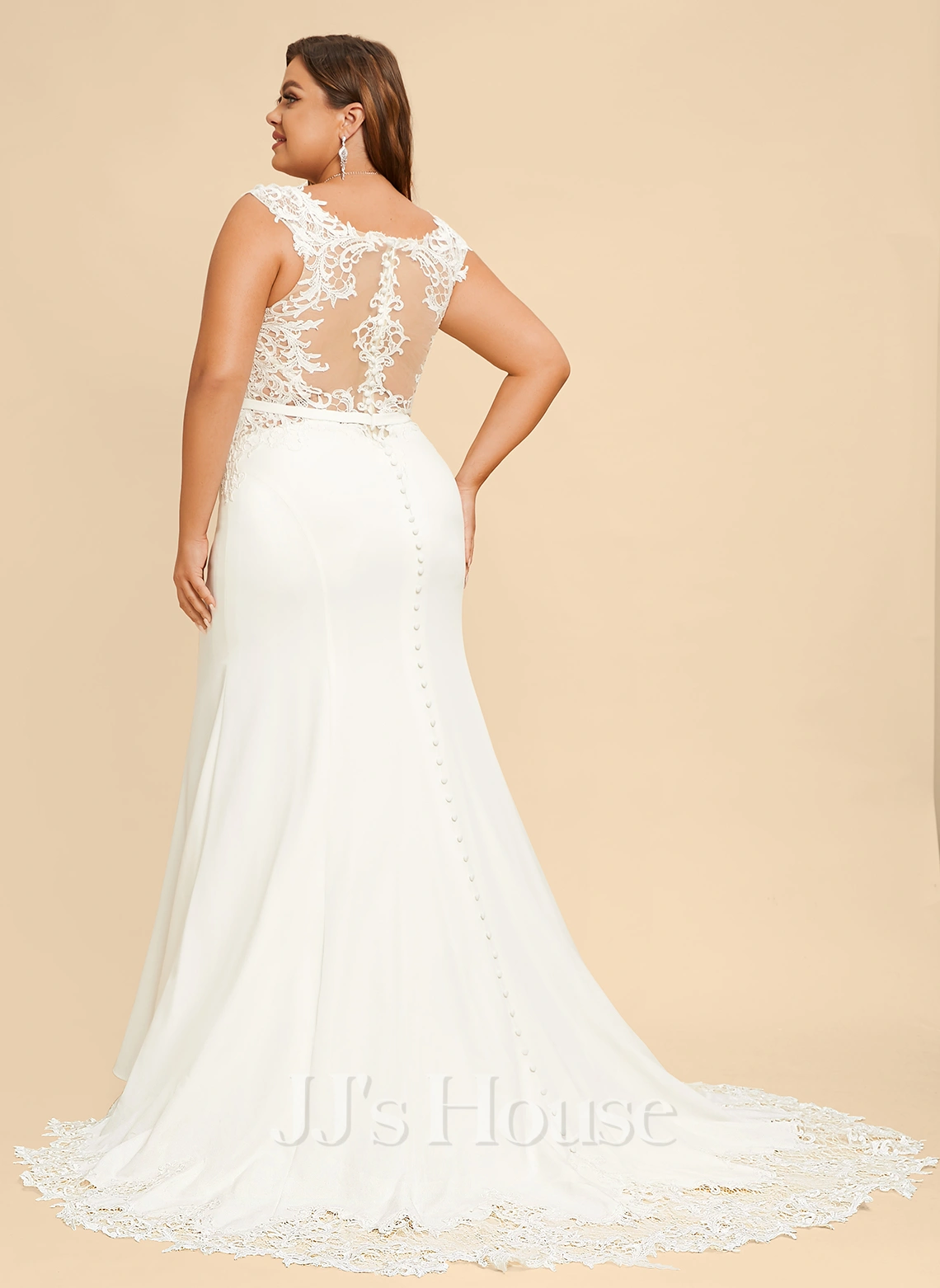 Une robe de mariée sirène en crêpe stretch et dentelle avec la traîne moyenne vous apporte un effet élégant et raffiné. La dentelle pare le dos transparent, les bretelles et les deux côtés de la taille. Cette création est décorée de bouton recouvert sur la fermeture éclair au dos.