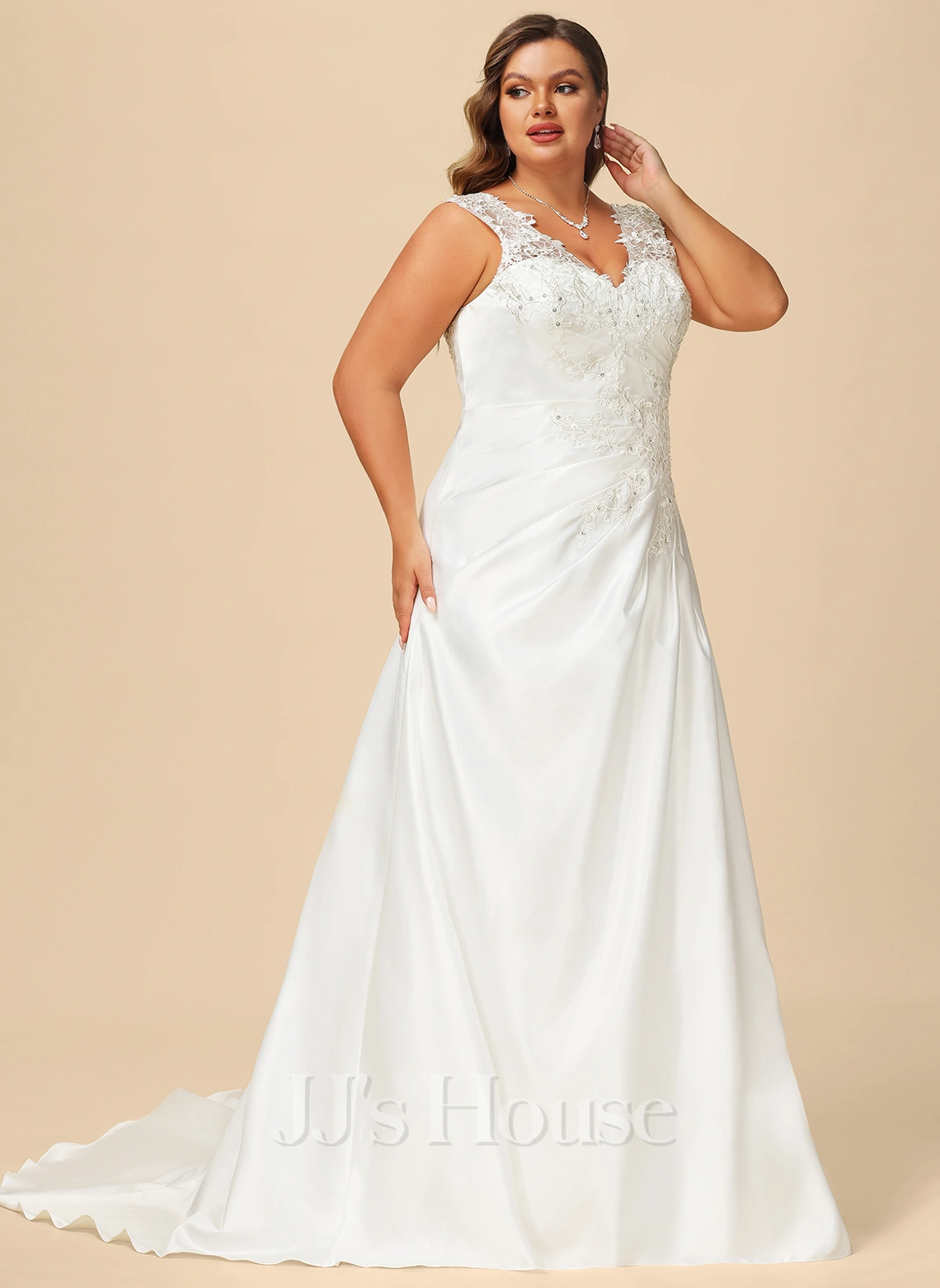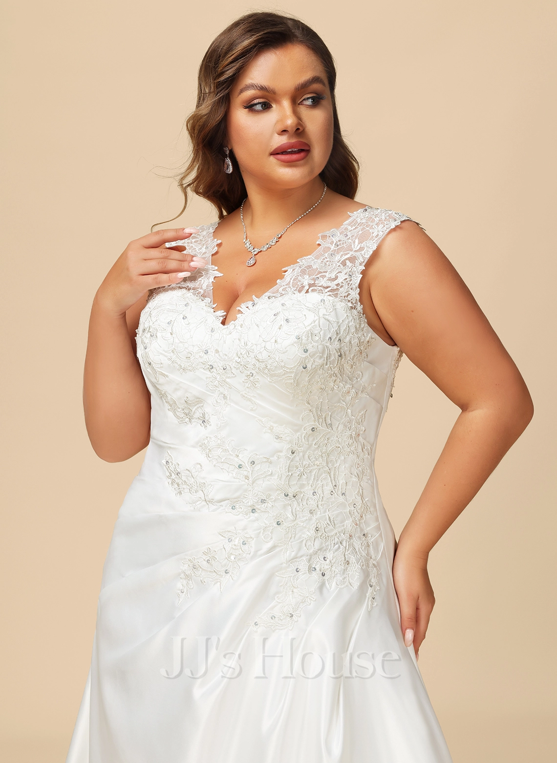 Célébrez votre grand jour avec cette robe princesse à traîne balayage ! Elle se caractérise par le décolleté en V devant et derrière, les motifs en dentelle et les paillettes recouvrent le haut, la coupe légèrement cintrée et plissée, et le tissu satiné.