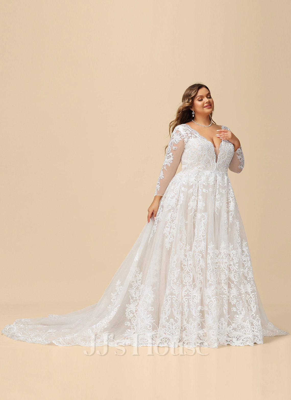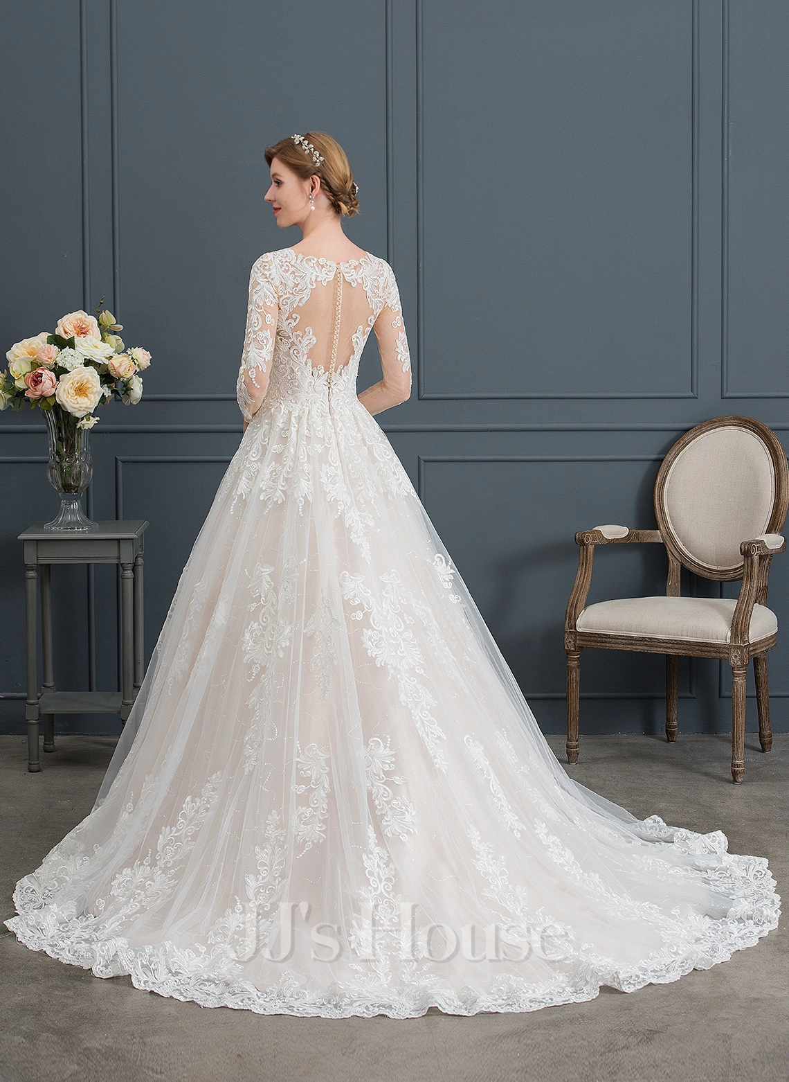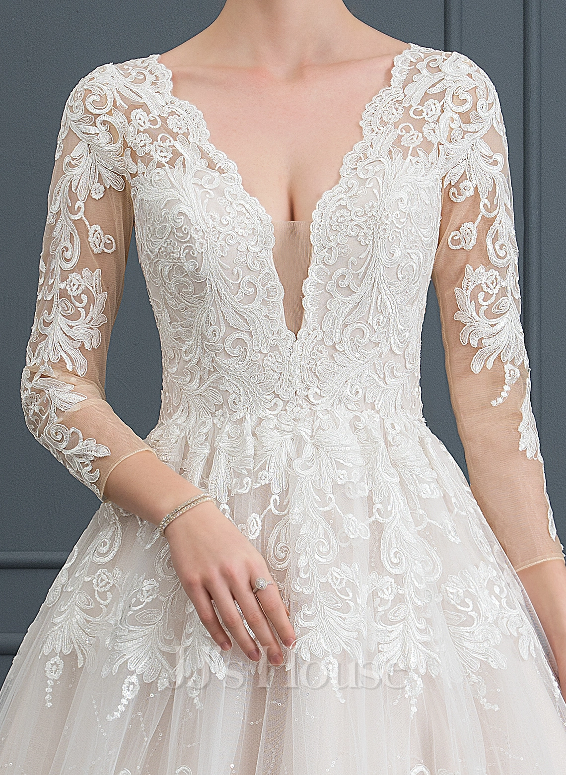 Le point de cette robe de mariée est sa traîne mi-longue et son tissu tulle brodé de dentelle raffinée.