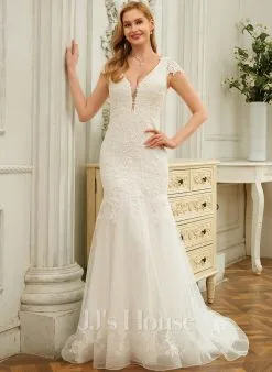 Pour un mariage princier, une robe de mariée princesse en col V est bien convenable. Les ornements recouvrant le haut sans manches sont les points lumineux pour une robe de mariage en satin. Cette robe à traîne moyenne vous va bien à porter lors d’un mariage à l’église.