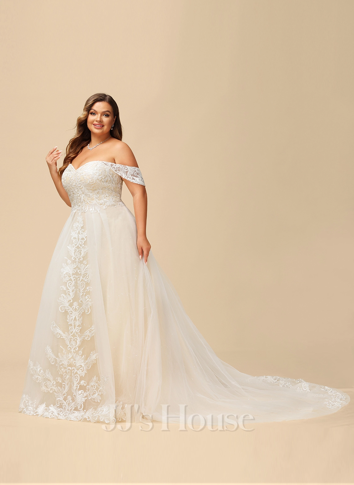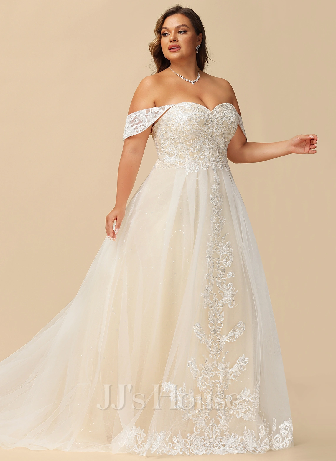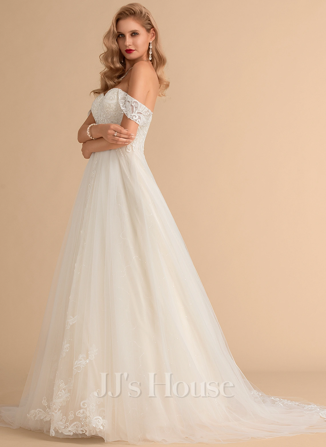 - Avec une traîne mi-longue, cette robe à épaules dénudées est confectionnée en tulle vaporeux et dentelle élégante.