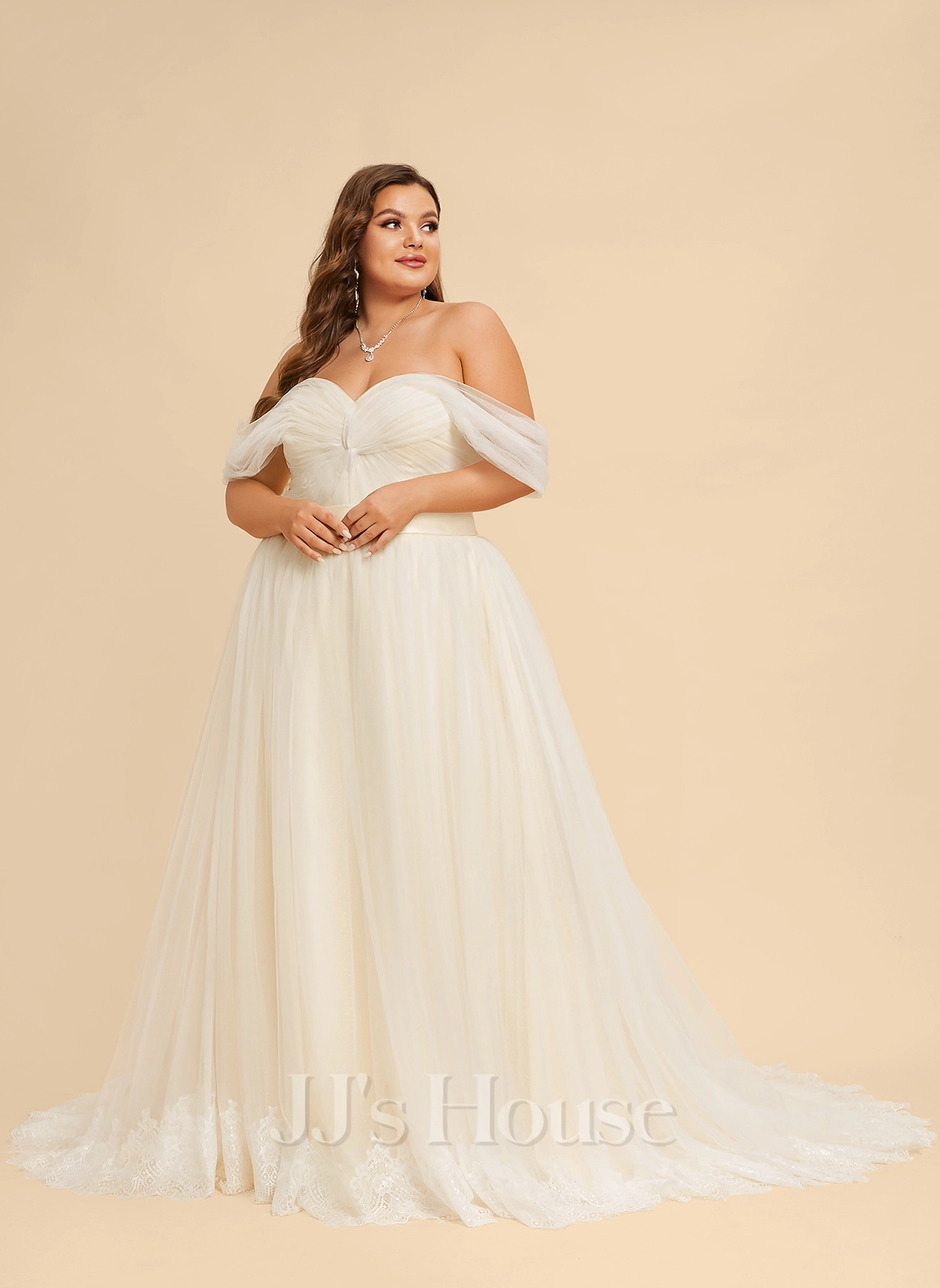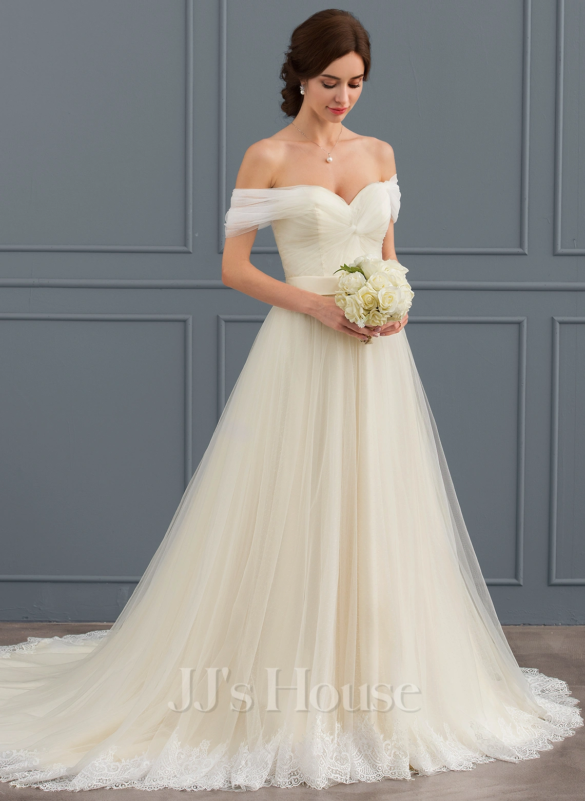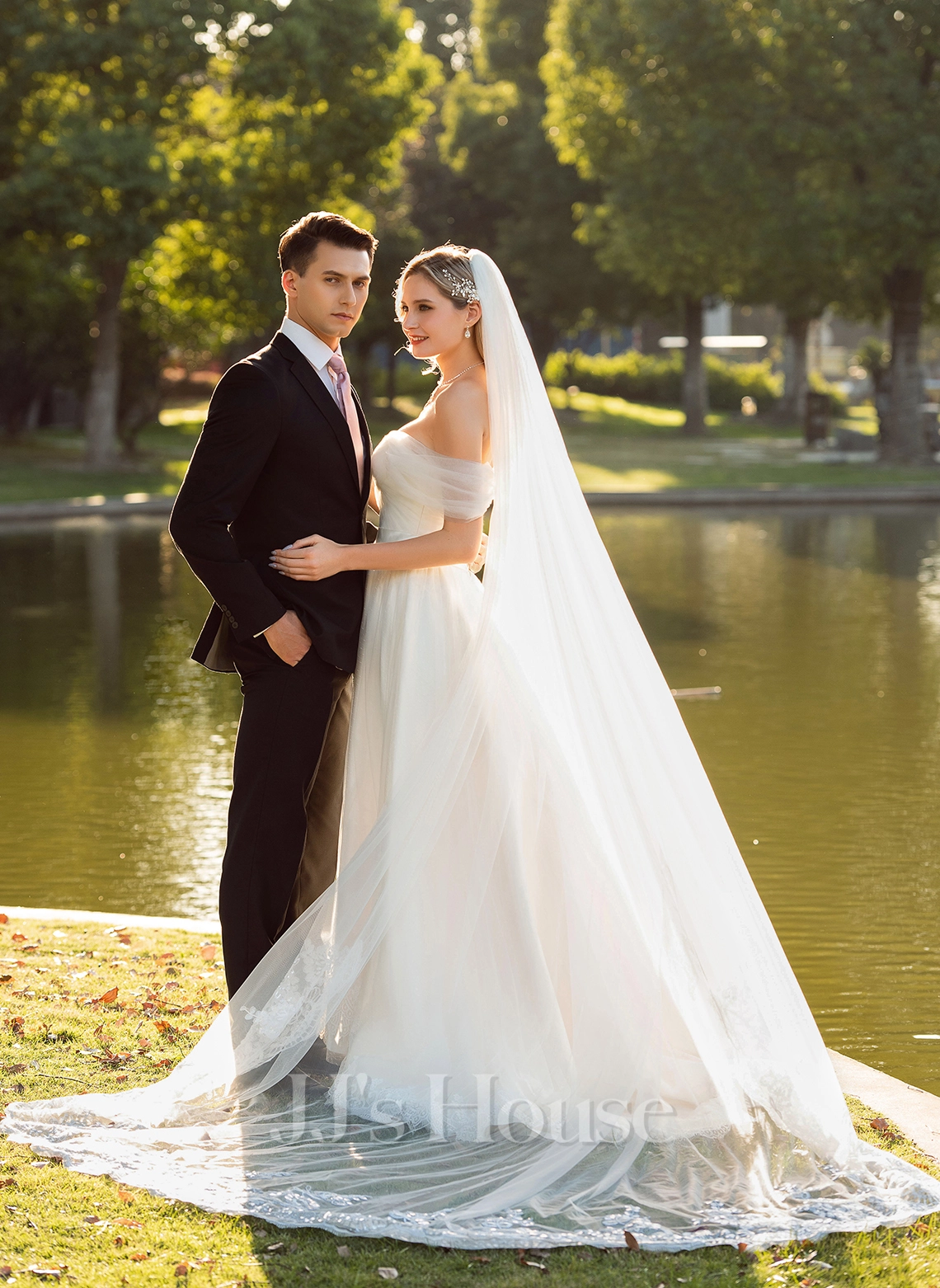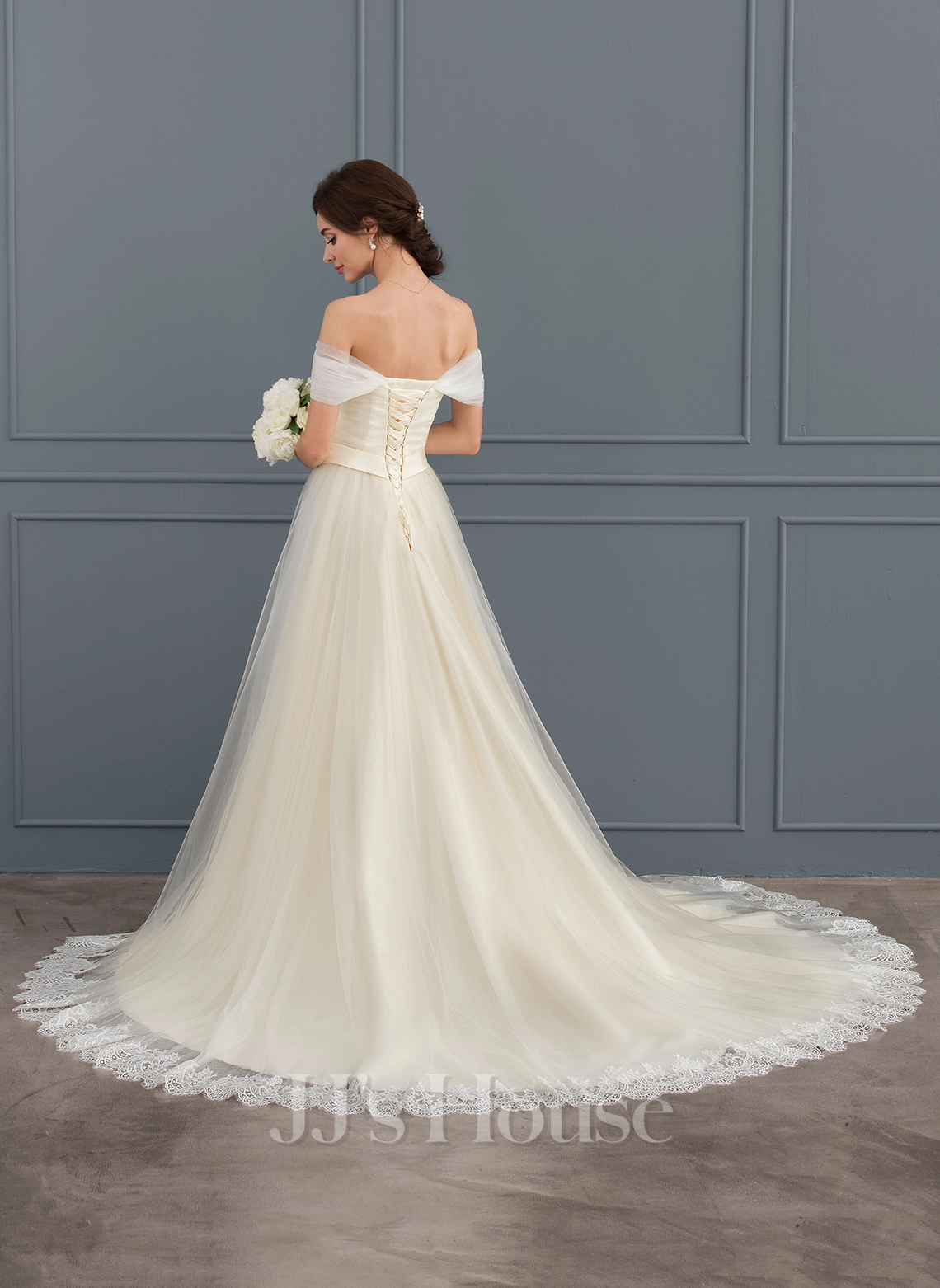 Une spéciale robe de mariée marquise, à épaules dénudées, à traîne moyenne, confectionnée en tulle et ornée de dentelle au bord de la jupe plissée, est soulignée par le design du devant de son bustier et ses manches, ainsi que le laçage sur le dos.