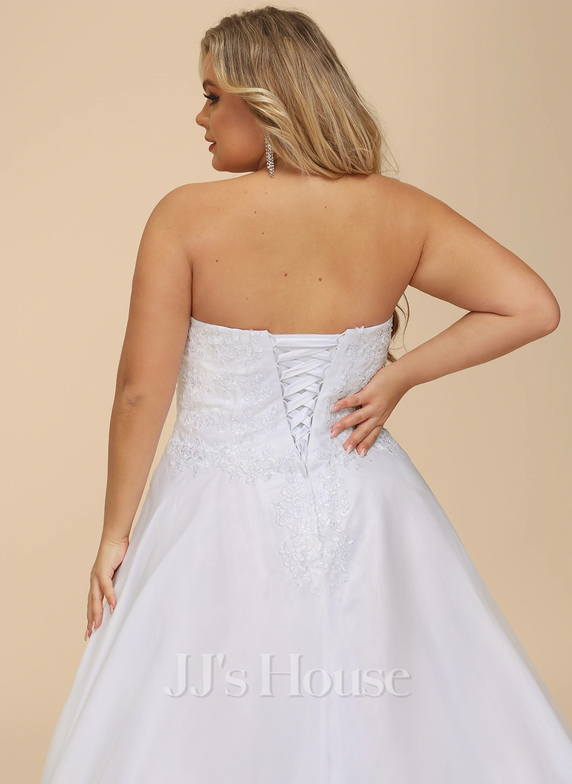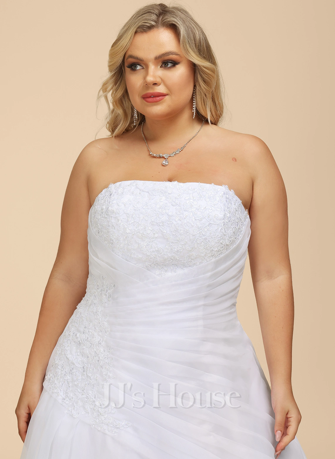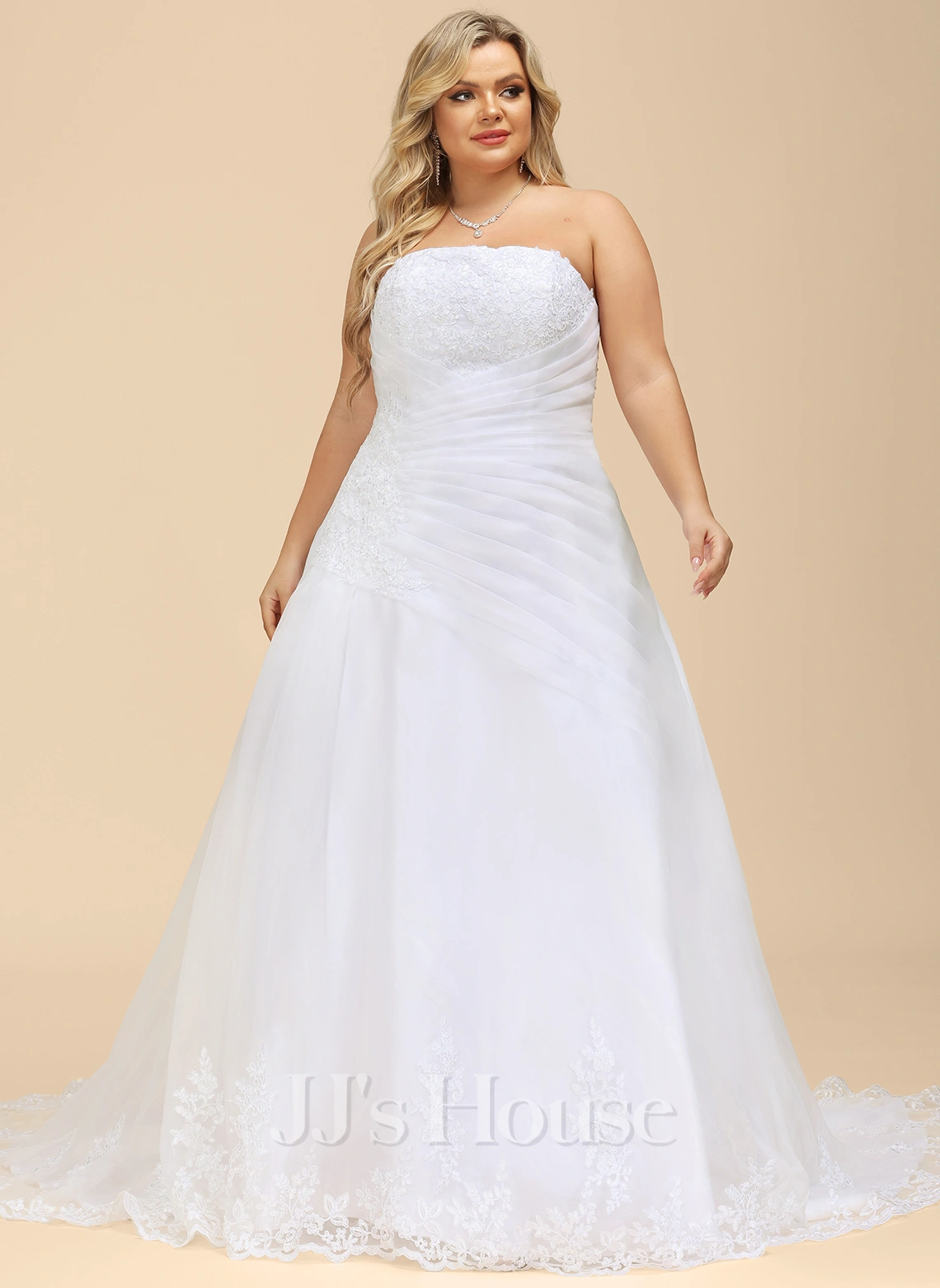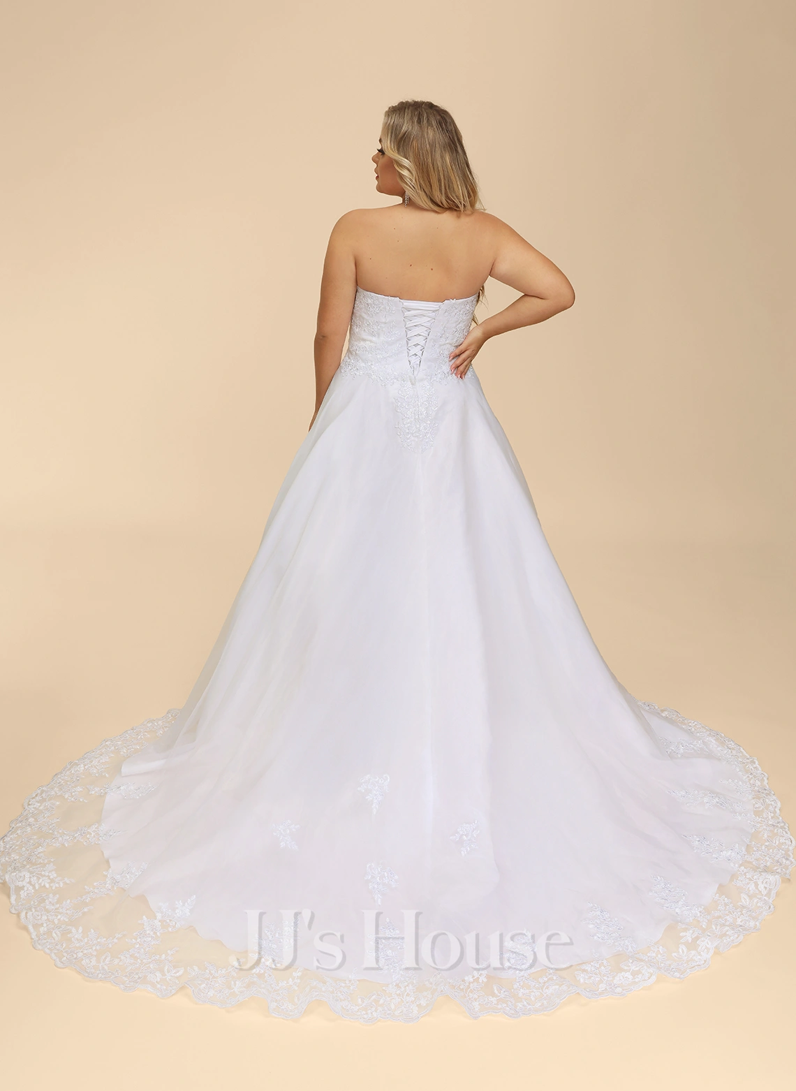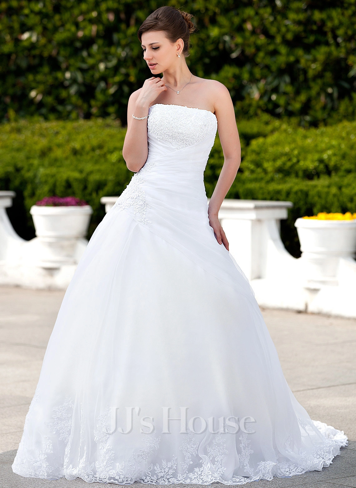 C’est une robe bustier en forme princesse qui est fabriquée en organza. Les ornements en dentelle sont décorés sur la poitrine, le dos, la droite de la taille et les bords de la jupe à traîne mi-longue. Cette robe de mariée est également plissée à la taille et a un laçage au dos.