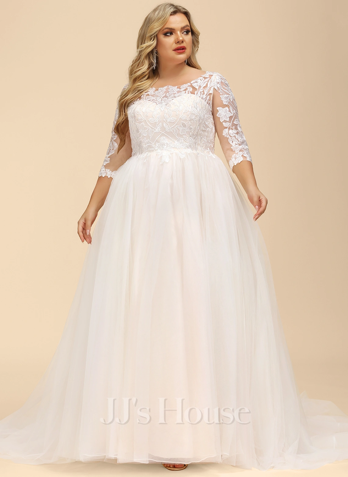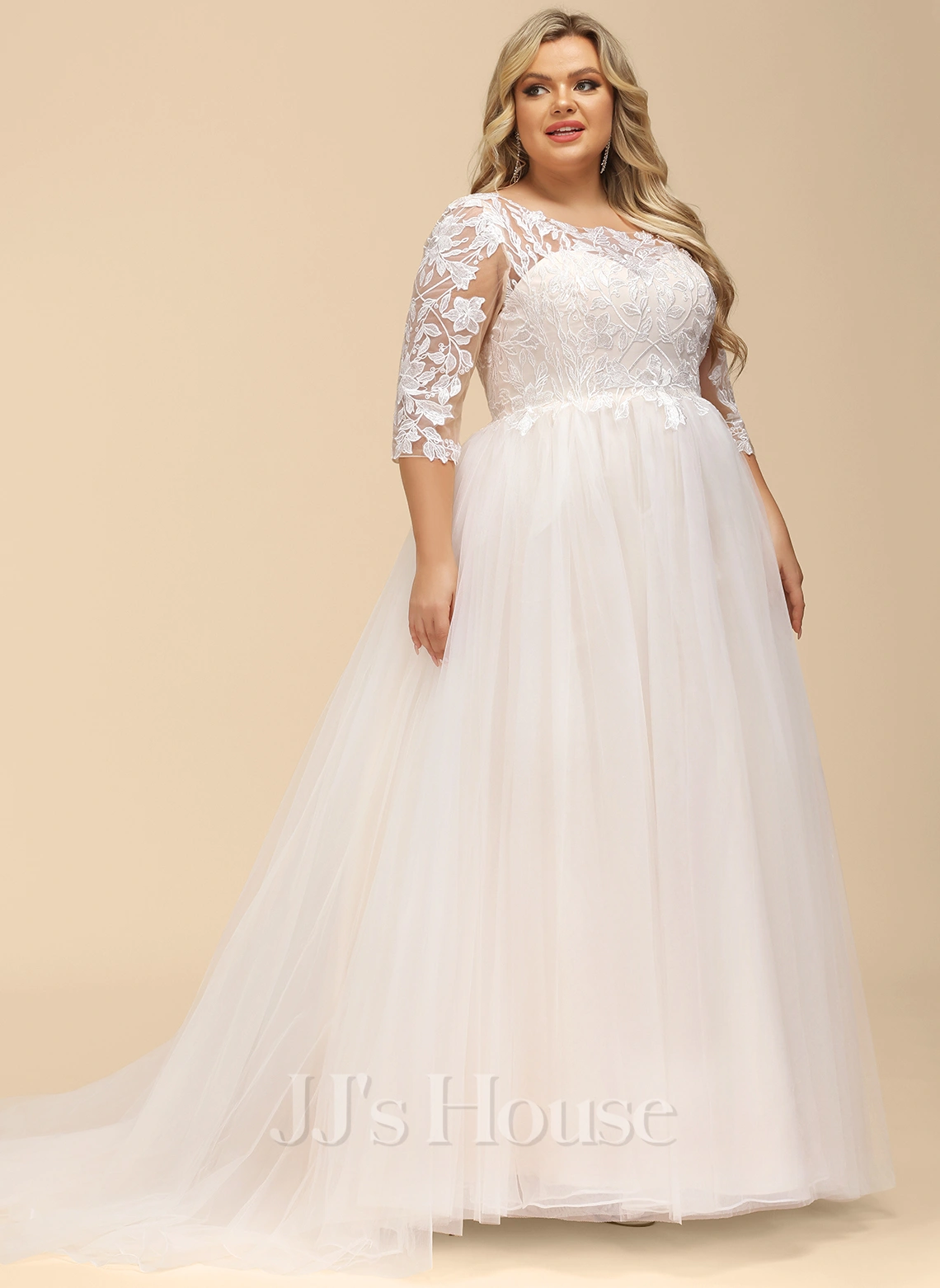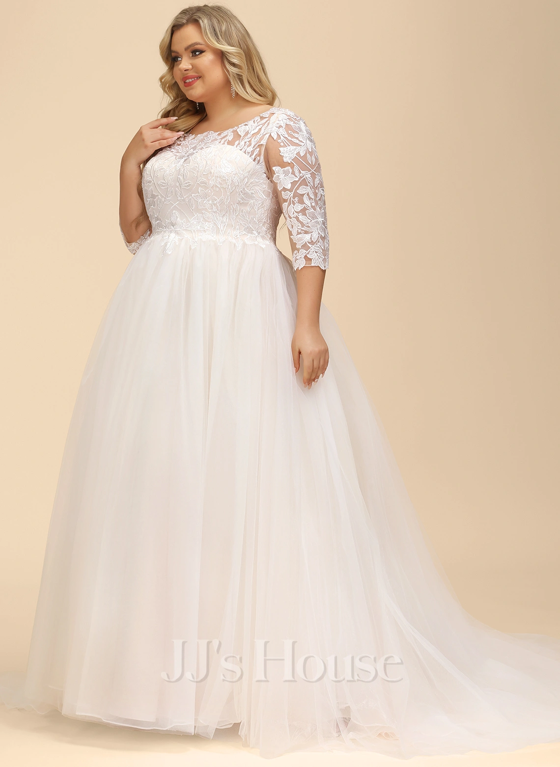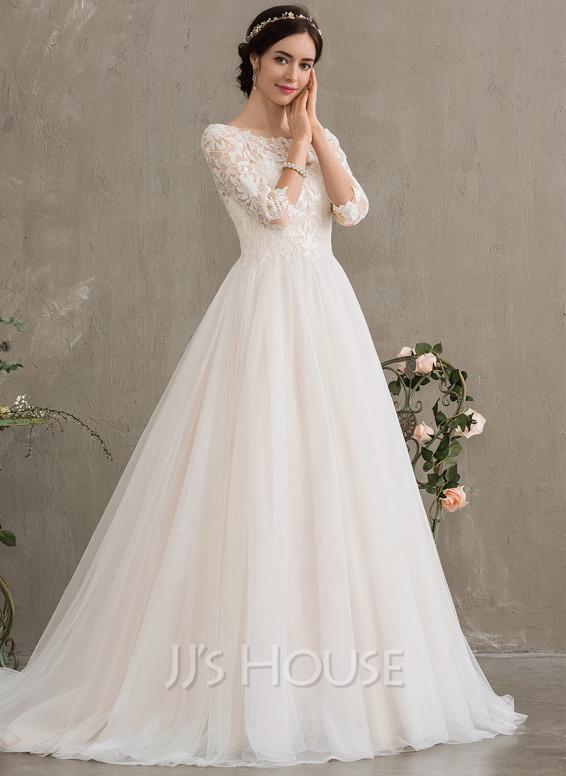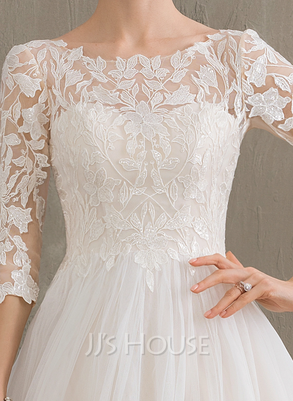 Le corsage et les manches 1/2 de cette robe en col rond mais à décolleté en V au dos sont confectionnés en dentelle avec des paillettes. Un autre tissu de cette robe à traîne moyenne est tulle. Nous vous conseillons de porter un bracelet. Elle vous fait ressembler à une princesse dans un mariage.