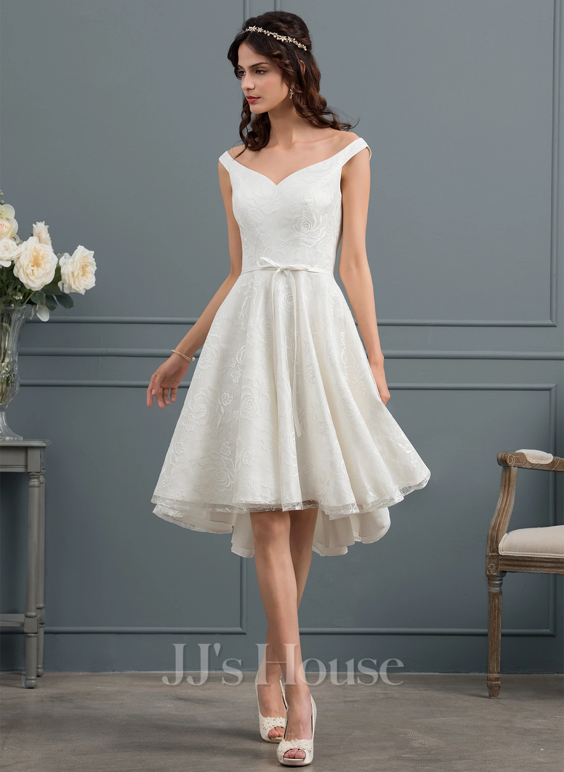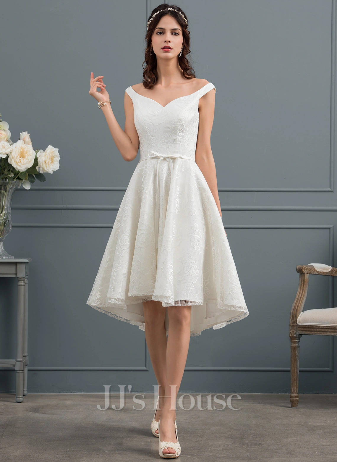 Toute la robe de mariée courte est recouverte de dessins floraux en dentelle avec une doublure satinée à l’intérieur. Le style asymétrique, les épaules tombantes et le ruban détachable en satin sont les caractéristiques de cette robe. Ajoutez des talons hauts pour un look joli.