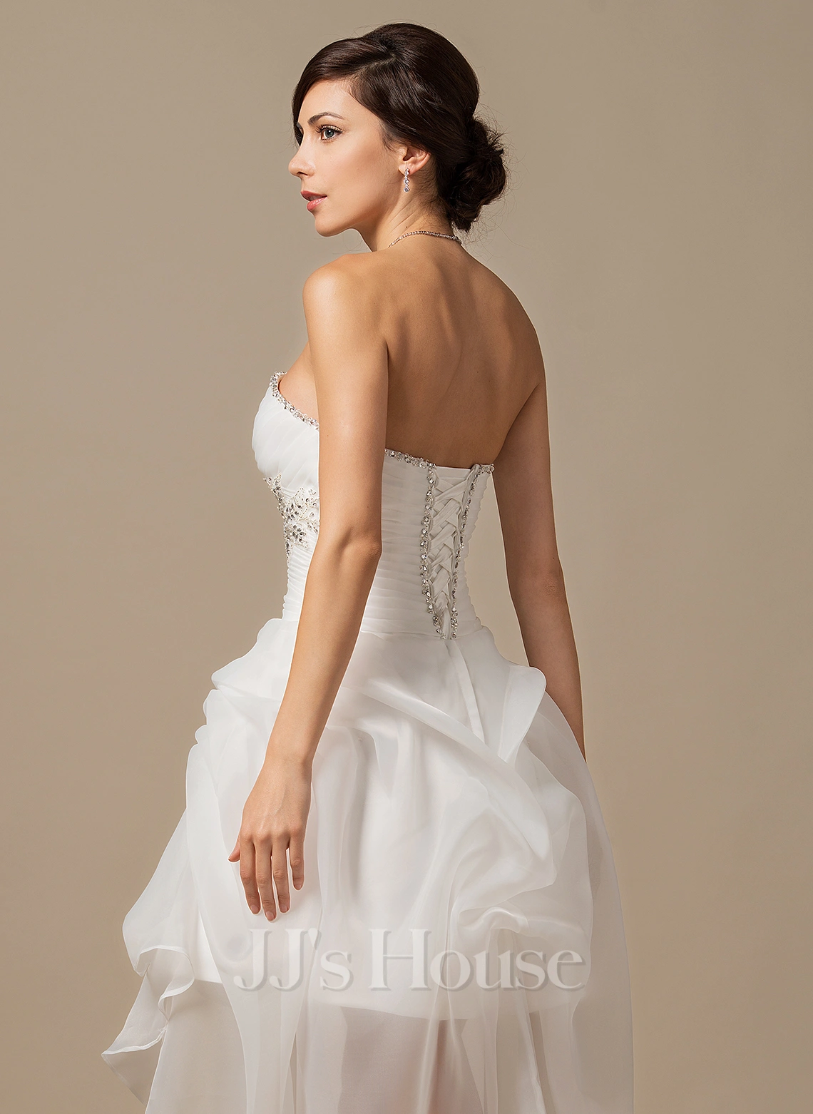 La jupe plissée, le style asymétrique, le décolleté en cœur, les paillettes en haut de bustier et aux deux côtés de cette robe de mariée, accentuent un effet glamoureux et ultra-chic. De plus, elle utilise le laçage et la fermeture éclair sur le dos.