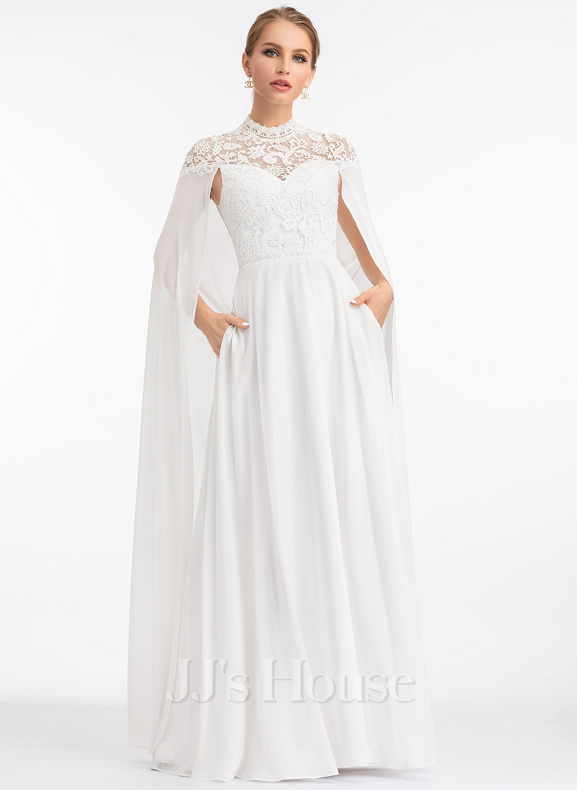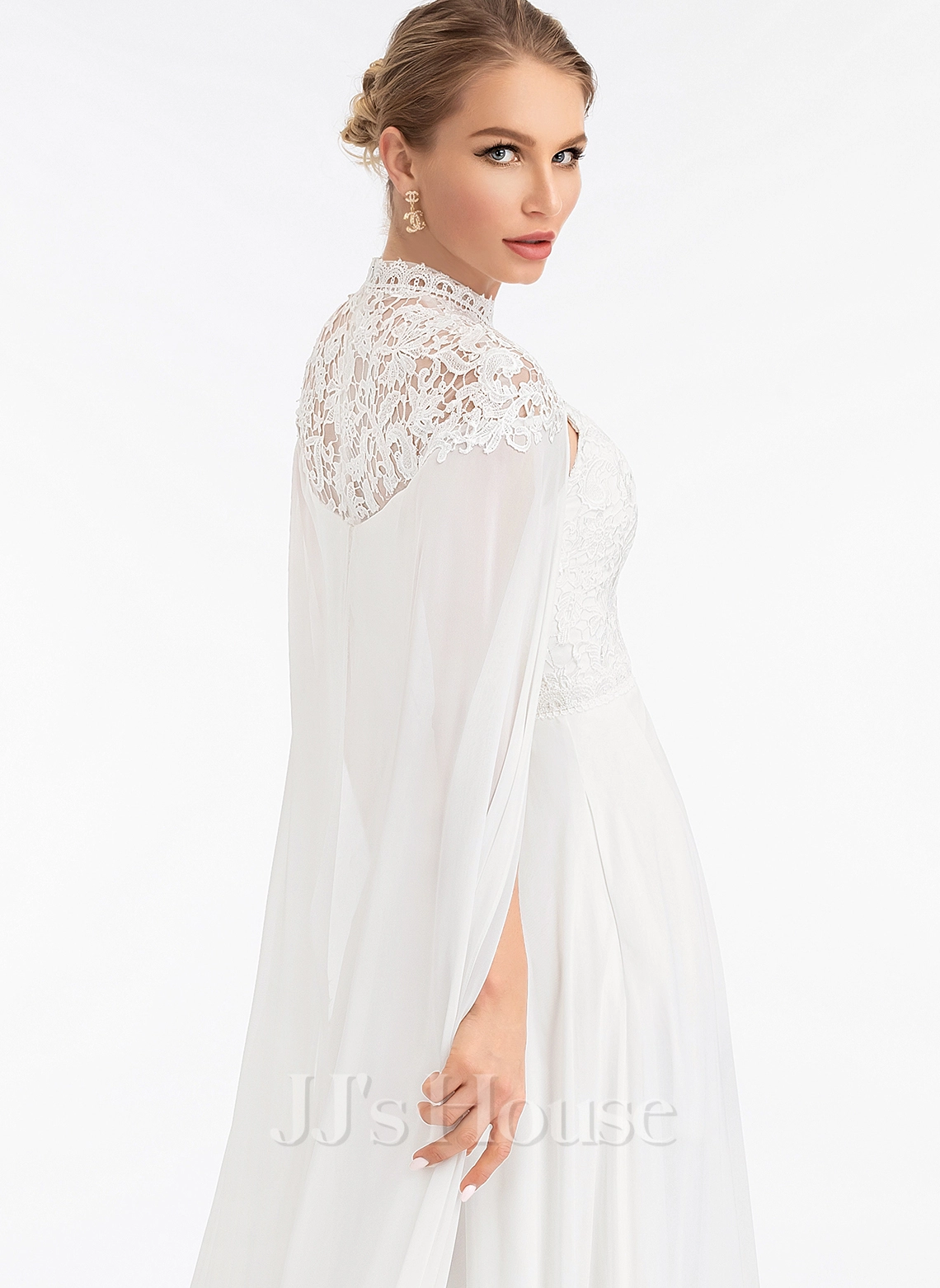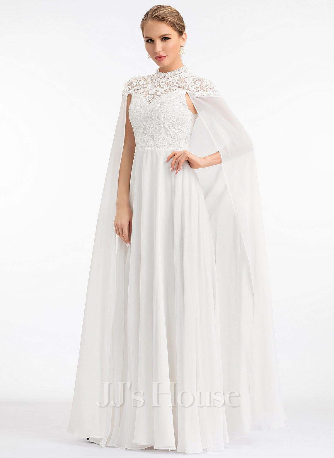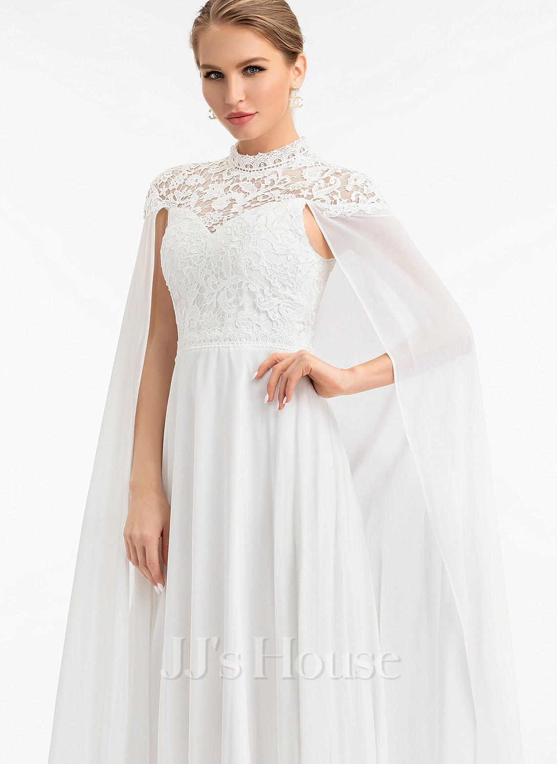 Dans cette robe de mariée évasée en mousseline, vous allez devenir une future mariée noble et marquante grâce à sa cape et sa longueur ras du sol. Son corsage, surtout ses épaules, est recouvert de motifs en dentelle pour ajouter une touche romantique.