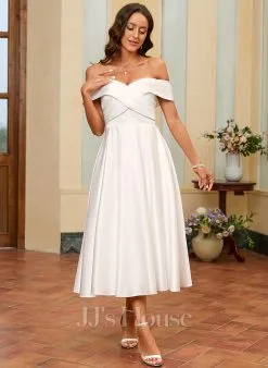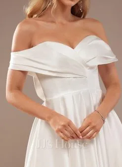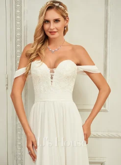 JJsHouse Robe Trapèze épaule Dénudée Asymétrique Mousseline Dentelle Robe De Mariée Avec Plissée