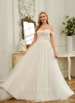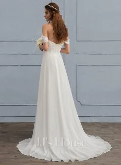 JJsHouse Robe Trapèze épaule Dénudée Balayage/pinceau Train Mousseline Dentelle Robe De Mariée