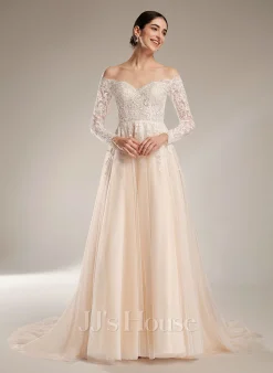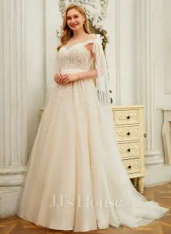 JJsHouse Robe Marquise/princesse épaule Dénudée Traîne Moyenne Dentelle Tulle Robe De Mariée Avec Brodé Paillettes