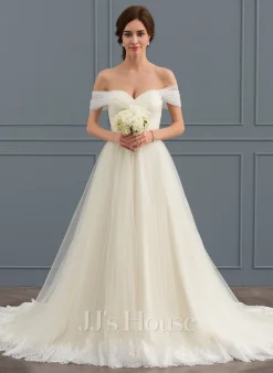 JJsHouse Robe Marquise/princesse épaule Dénudée Traîne Moyenne Dentelle Tulle Robe De Mariée Avec Plissé