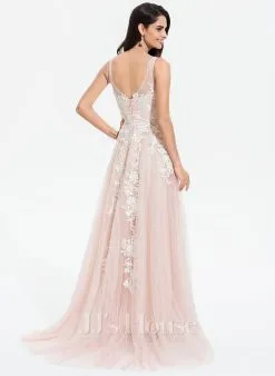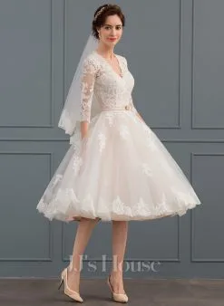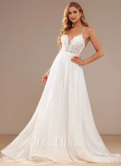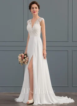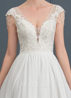 JJsHouse Robe Trapèze Col V Balayage/pinceau Train Mousseline Dentelle Robe De Mariée