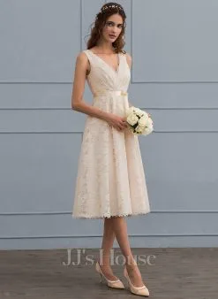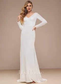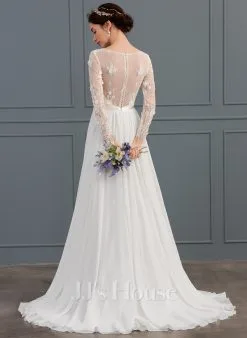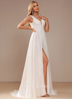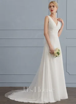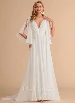 JJsHouse Robe Trapèze Col V Balayage/pinceau Train Mousseline Robe De Mariée Avec Arc