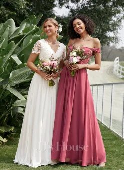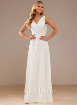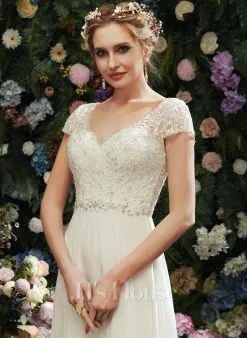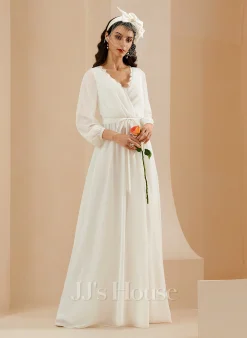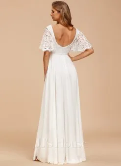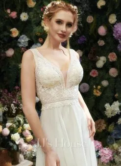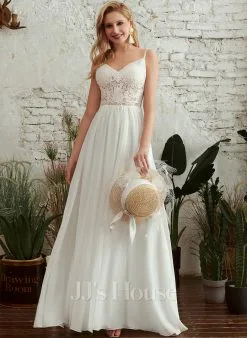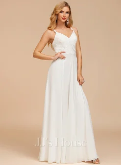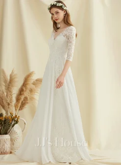 JJsHouse Robe Trapèze Col V Longueur Ras Du Sol Mousseline Dentelle Robe De Mariée Avec Brodé