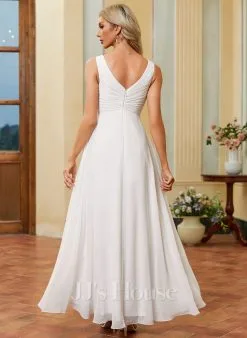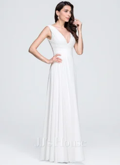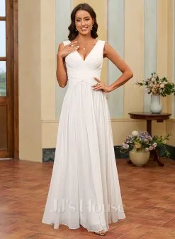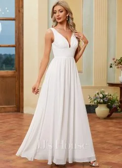 JJsHouse Robe Trapèze Col V Longueur Ras Du Sol Mousseline Robe De Mariée Avec Plissée