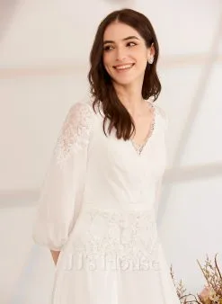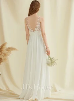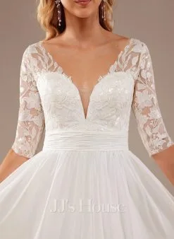 JJsHouse Robe Trapèze Col V Longueur Ras Du Sol Mousseline Dentelle Robe De Mariée Avec Plissé