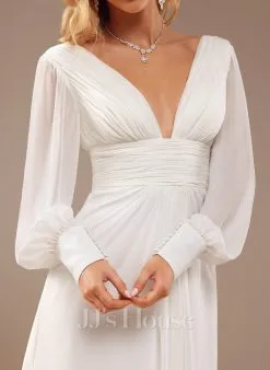 JJsHouse Robe Trapèze Col V Longueur Ras Du Sol Mousseline Robe De Mariée Avec Plissé