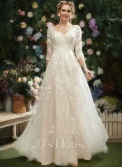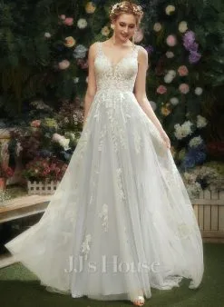 JJsHouse Robe Trapèze Col V Traîne Moyenne Dentelle Tulle Robe De Mariée Avec Paillettes