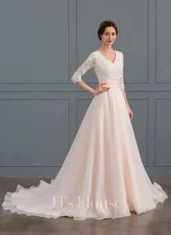 JJsHouse Robe Marquise/princesse Col V Traîne Moyenne Dentelle Satiné Robe De Mariée Avec Arc