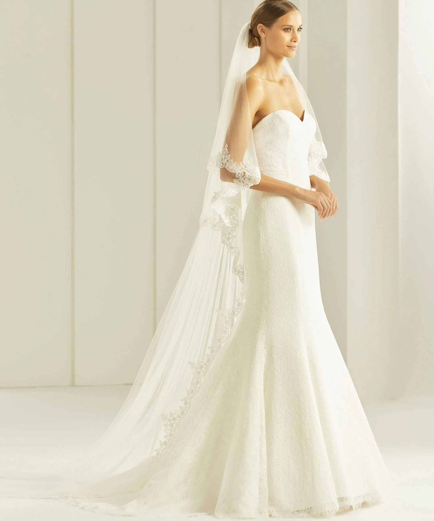 Voile de mariée ivoire très long en tulle souple.