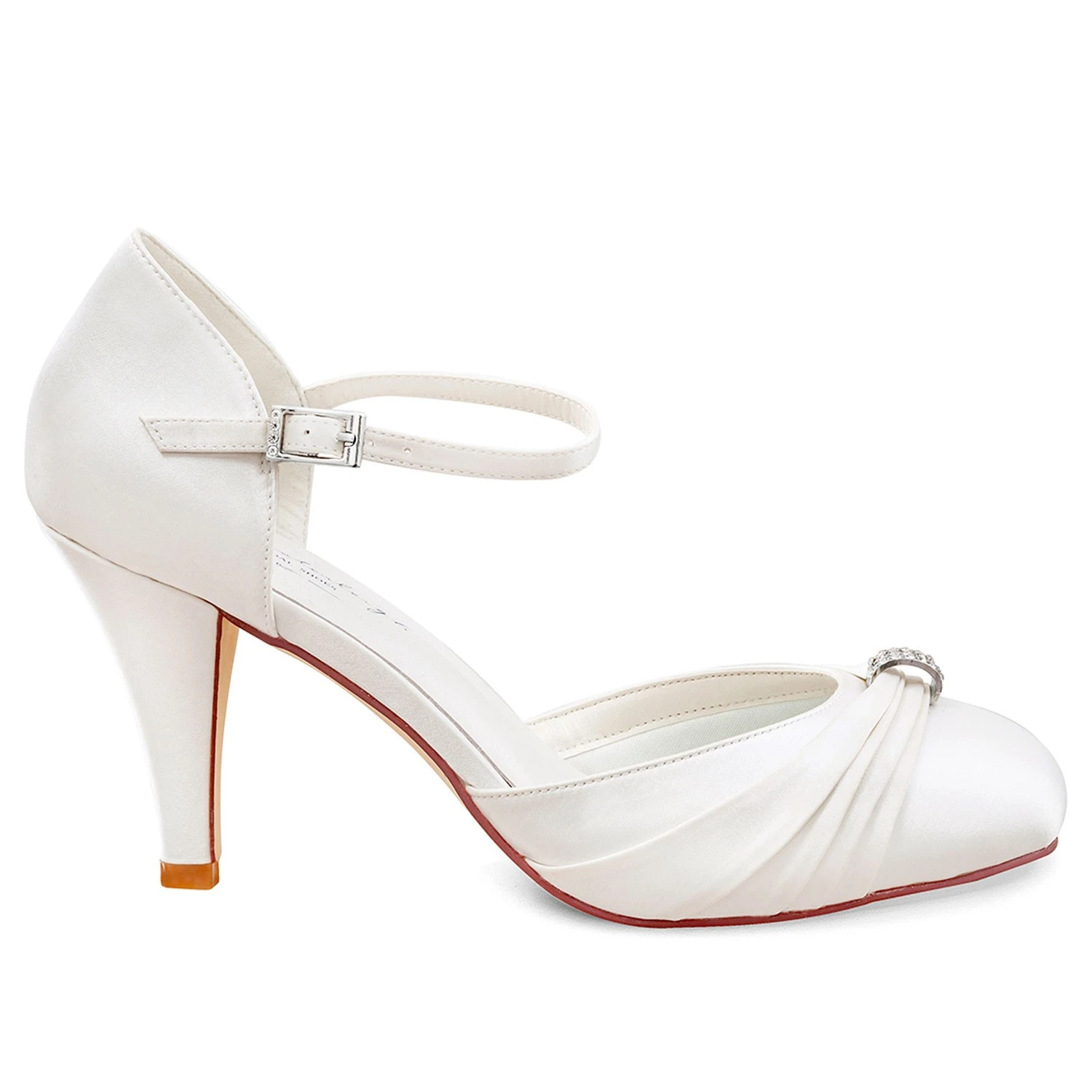 Délicats plissés de satin réunis par une applique en strass à l’avant de la chaussure.