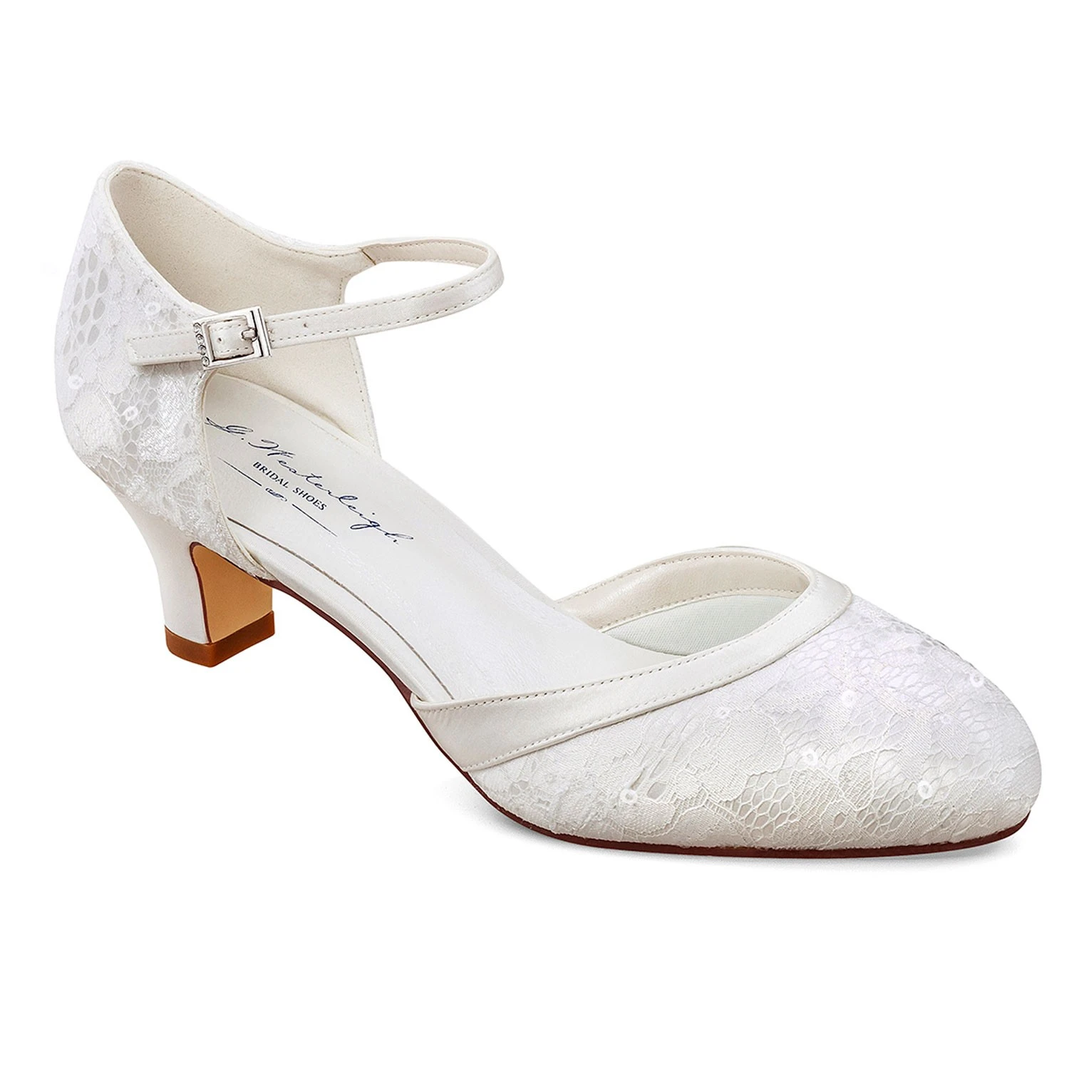 Chaussures de mariage à petit talon, proposées en dentelle ivoire.