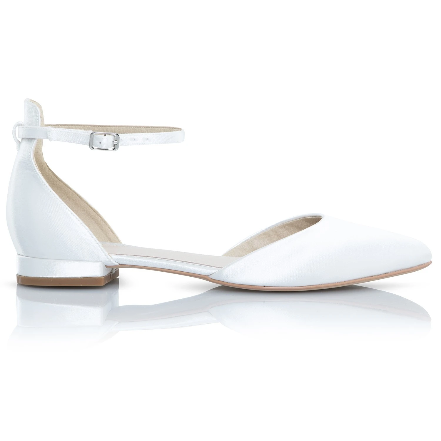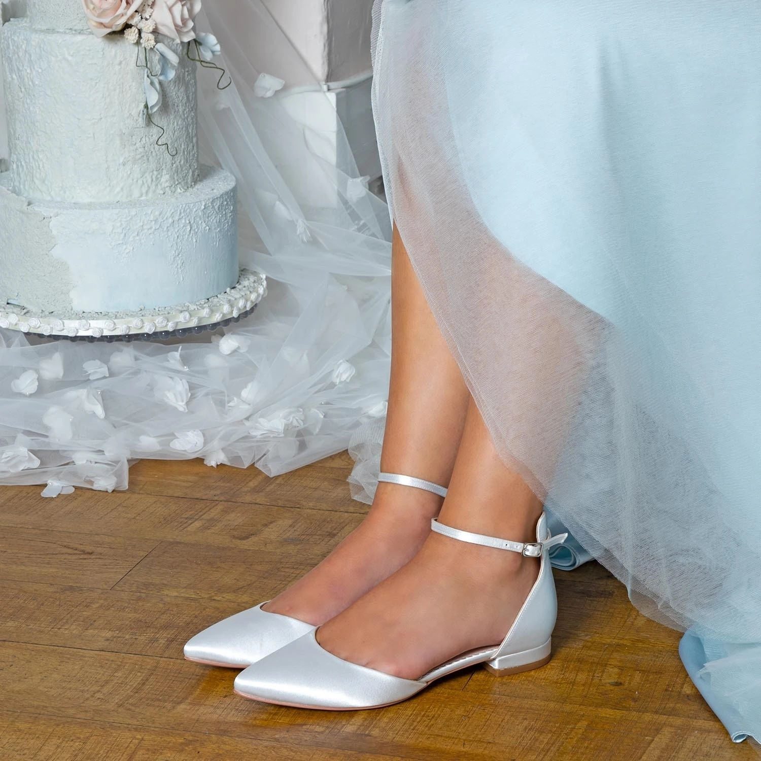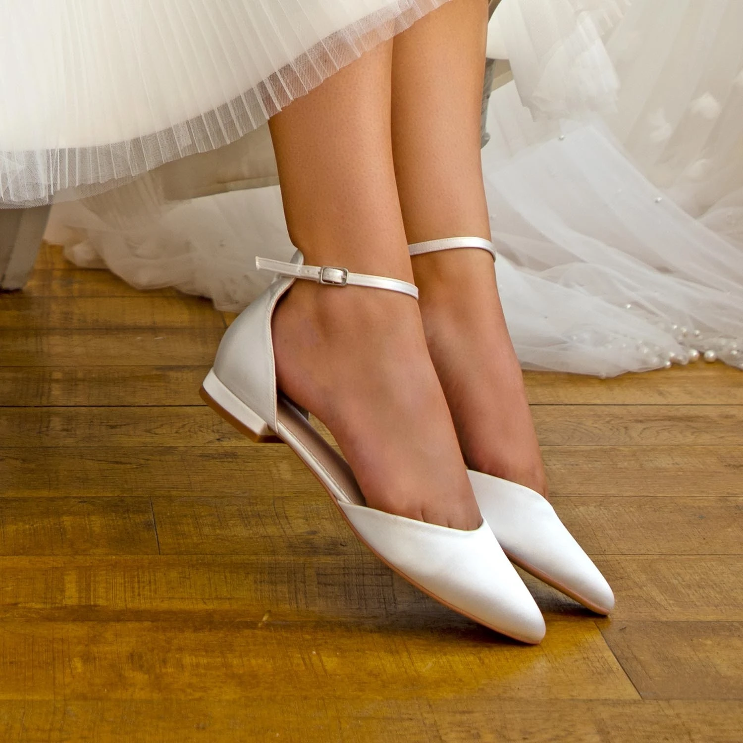 La chaussure Tilly est une chaussure de mariée plate et sophistiquée à bout pointu, dotée d’une délicate bride à la cheville et d’une doublure matelassée.