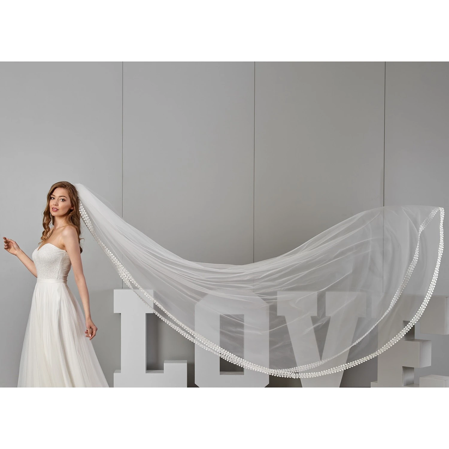 Voile de mariée ivoire très long habillé d’une bordure en dentelle bohème.