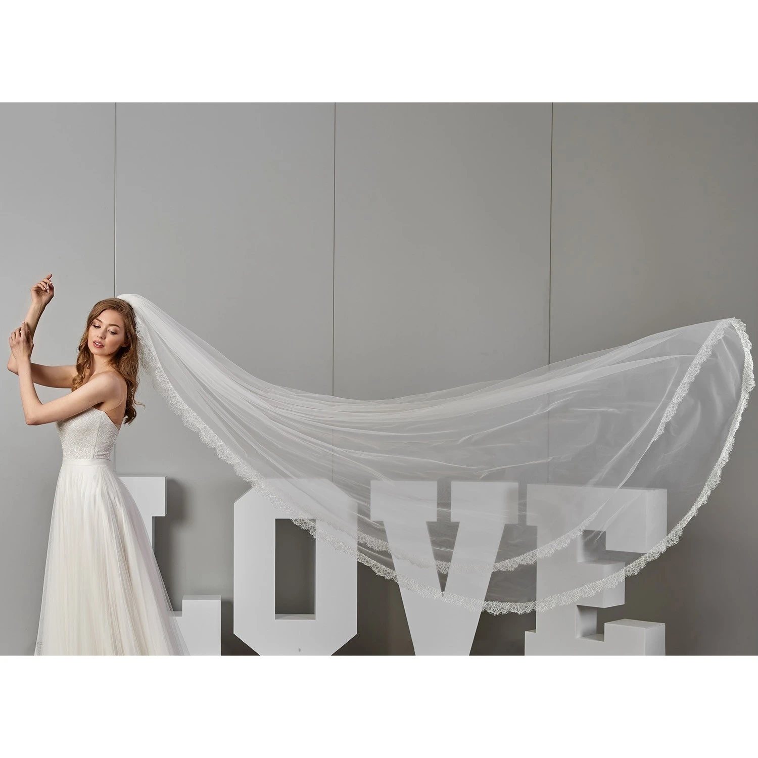 Voile de mariée romantique en tulle ivoire, décoré d’une jolie dentelle française en bordure.