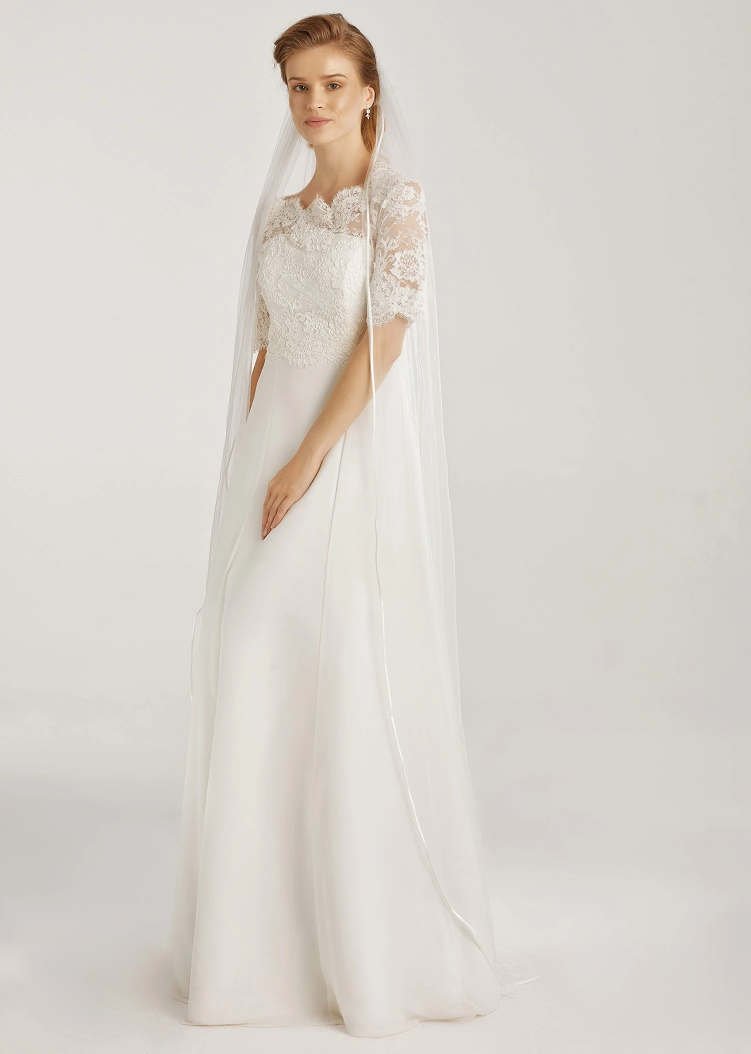 Voile de mariée long en tulle ivoire avec bordure en satin.