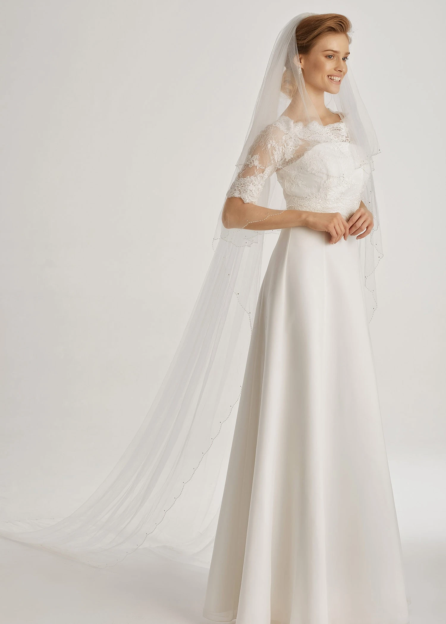 Voile de mariée très long en tulle ivoire avec bordure perlée.